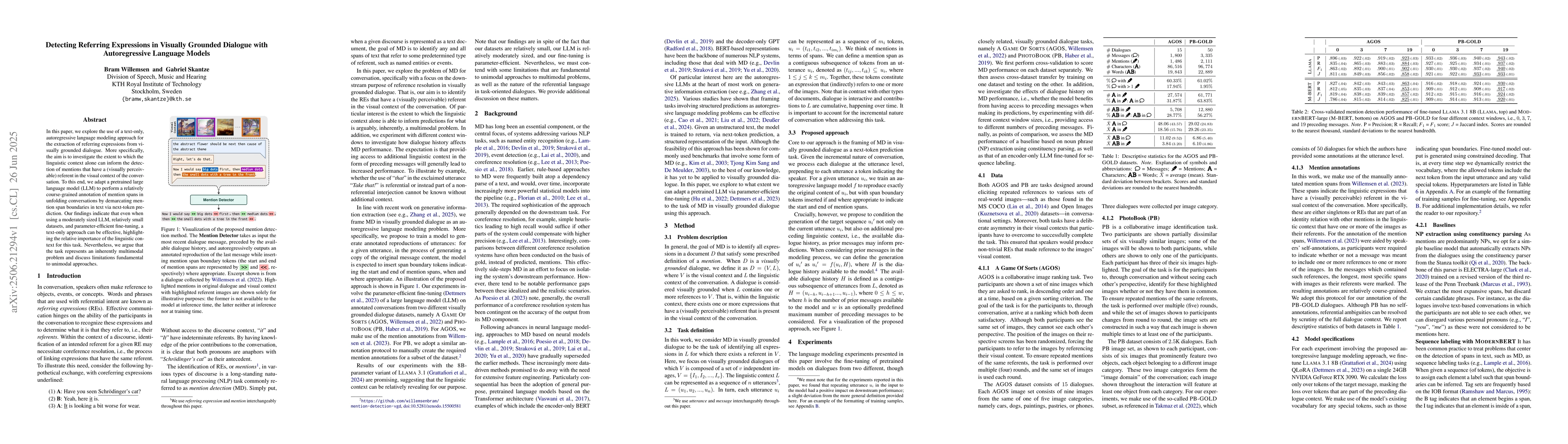 In this paper, we explore the use of a text-only, autoregressive language modeling approach for the extraction of referring expressions from visually grounded dialogue. More specifically, the aim is to investigate the extent to which the linguistic context alone can inform the detection of mentions that have a (visually perceivable) referent in the visual context of the conversation. To this end, we adapt a pretrained large language model (LLM) to perform a relatively course-grained annotation of mention spans in unfolding conversations by demarcating mention span boundaries in text via next-token prediction. Our findings indicate that even when using a moderately sized LLM, relatively small datasets, and parameter-efficient fine-tuning, a text-only approach can be effective, highlighting the relative importance of the linguistic context for this task. Nevertheless, we argue that the task represents an inherently multimodal problem and discuss limitations fundamental to unimodal approaches.