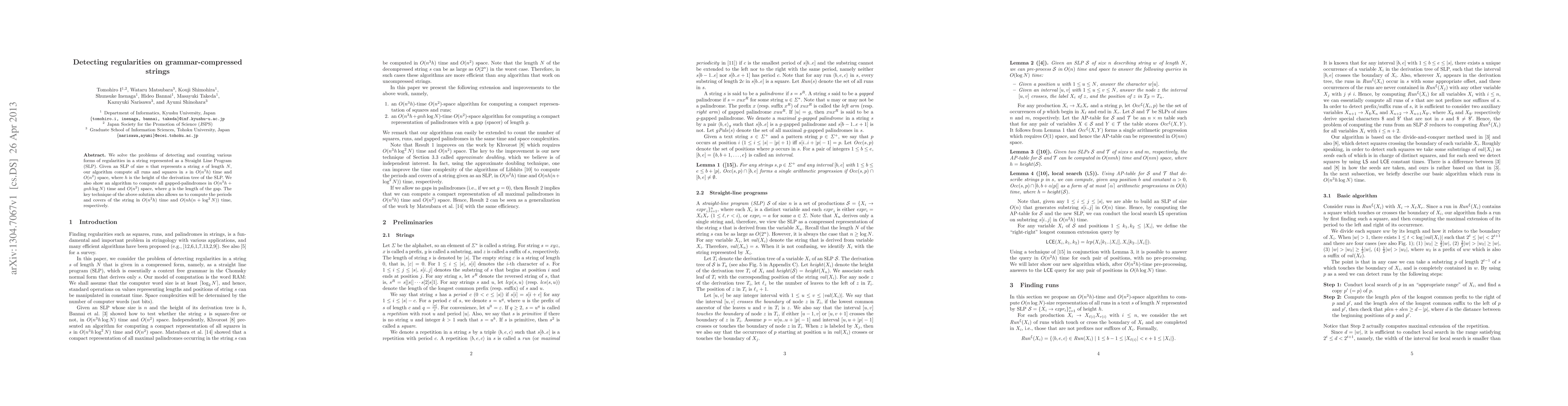 We solve the problems of detecting and counting various forms of regularities in a string represented as a Straight Line Program (SLP). Given an SLP of size $n$ that represents a string $s$ of length $N$, our algorithm compute all runs and squares in $s$ in $O(n^3h)$ time and $O(n^2)$ space, where $h$ is the height of the derivation tree of the SLP. We also show an algorithm to compute all gapped-palindromes in $O(n^3h + gnh\log N)$ time and $O(n^2)$ space, where $g$ is the length of the gap. The key technique of the above solution also allows us to compute the periods and covers of the string in $O(n^2 h)$ time and $O(nh(n+\log^2 N))$ time, respectively.
