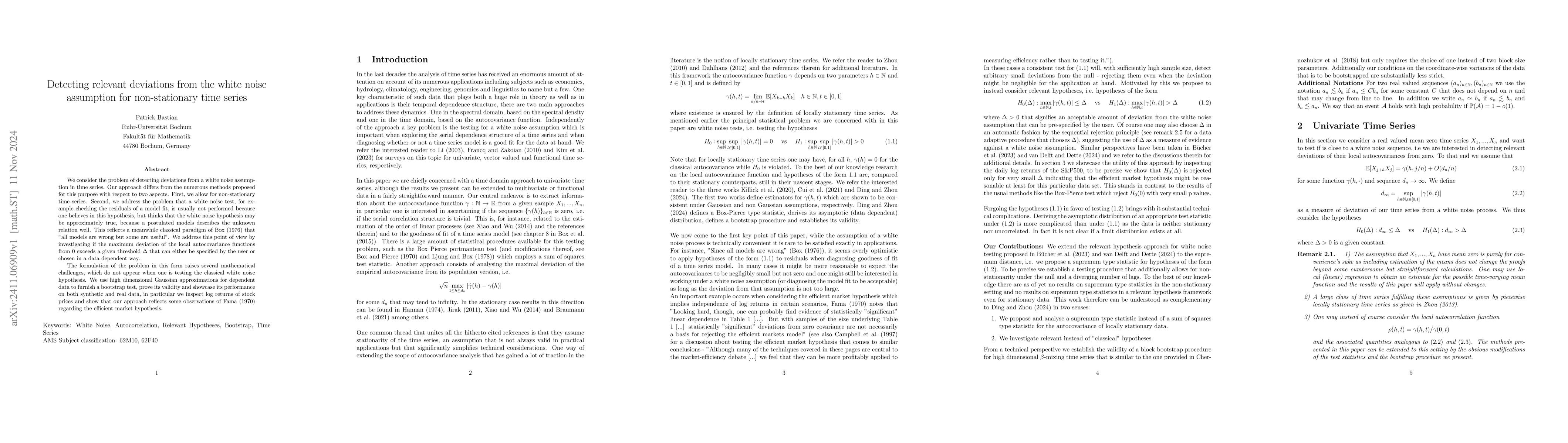 We consider the problem of detecting deviations from a white noise assumption in time series. Our approach differs from the numerous methods proposed for this purpose with respect to two aspects. First, we allow for non-stationary time series. Second, we address the problem that a white noise test, for example checking the residuals of a model fit, is usually not performed because one believes in this hypothesis, but thinks that the white noise hypothesis may be approximately true, because a postulated models describes the unknown relation well. This reflects a meanwhile classical paradigm of Box(1976) that "all models are wrong but some are useful". We address this point of view by investigating if the maximum deviation of the local autocovariance functions from 0 exceeds a given threshold $\Delta$ that can either be specified by the user or chosen in a data dependent way. The formulation of the problem in this form raises several mathematical challenges, which do not appear when one is testing the classical white noise hypothesis. We use high dimensional Gaussian approximations for dependent data to furnish a bootstrap test, prove its validity and showcase its performance on both synthetic and real data, in particular we inspect log returns of stock prices and show that our approach reflects some observations of Fama(1970) regarding the efficient market hypothesis.