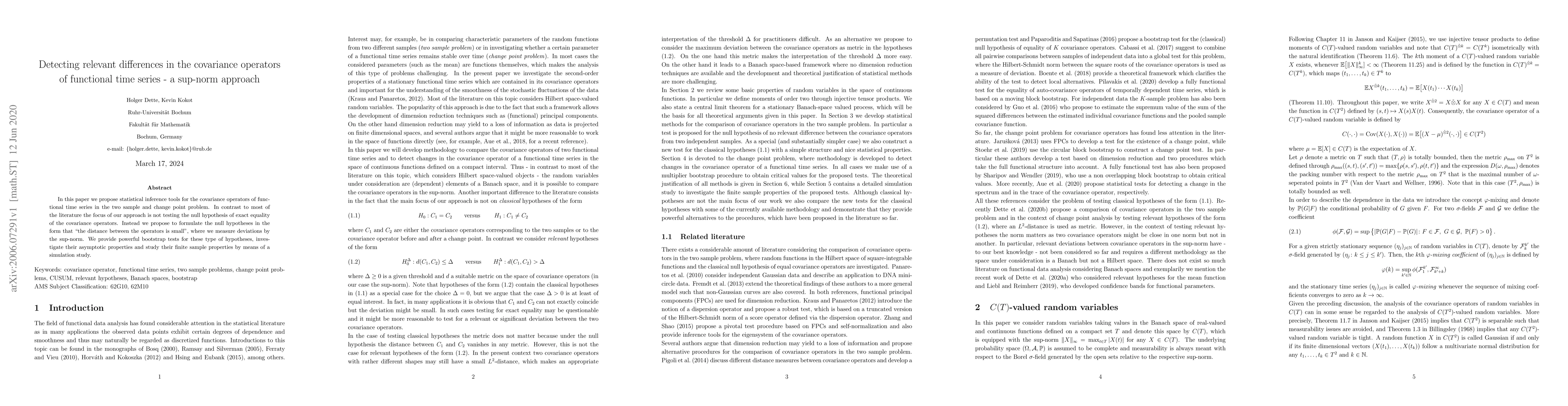 This paper introduces statistical tools for detecting differences in covariance operators of functional time series, focusing on a sup-norm approach rather than testing for exact equality. It proposes bootstrap tests for these hypotheses, examines their asymptotic and finite sample properties, and validates the method through simulations.
