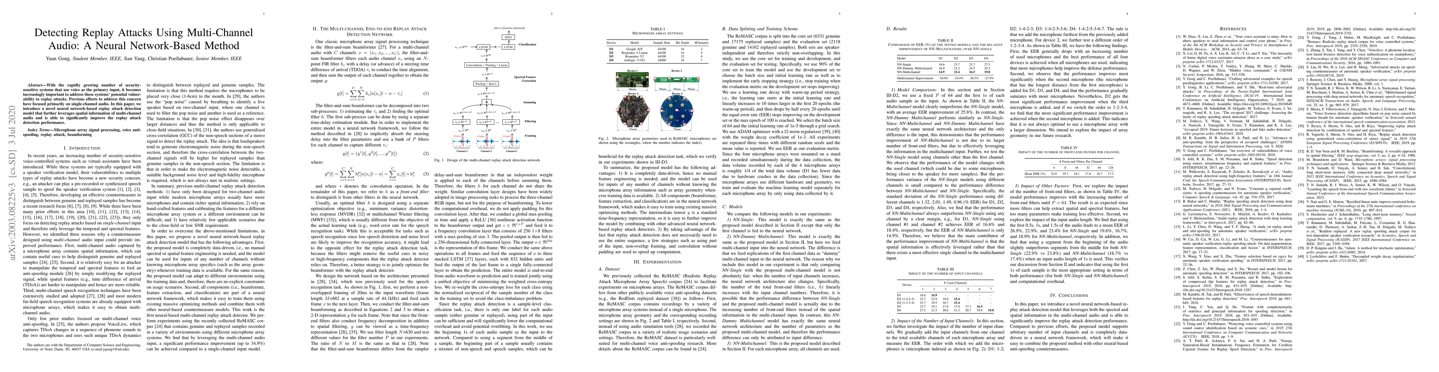This paper proposes a neural network-based method for detecting replay attacks using multi-channel audio, leveraging spatial information to enhance detection performance compared to single-channel approaches. The model aims to improve the security of voice-based systems against replay attacks.