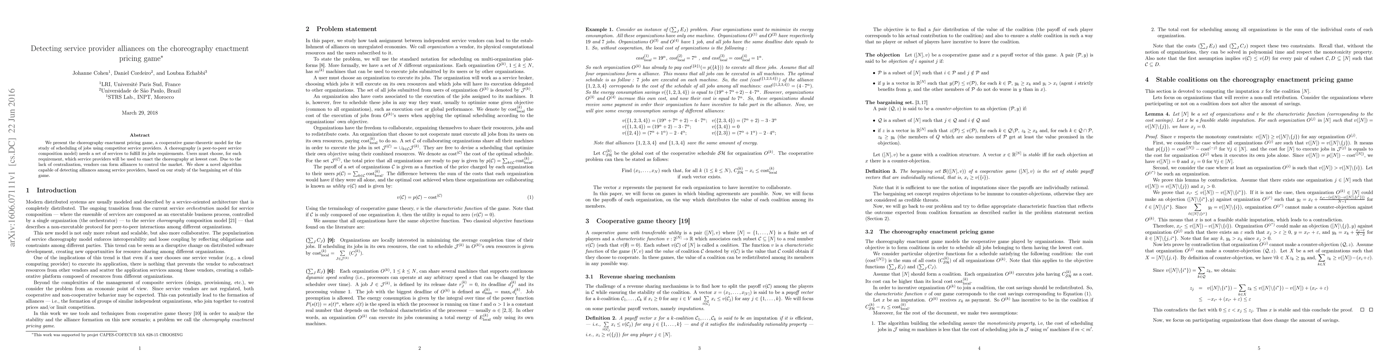 This paper introduces a game-theoretic model for scheduling jobs using competing service providers, focusing on detecting alliances among them. It presents an algorithm to identify these alliances based on the bargaining set of the choreography enactment pricing game.