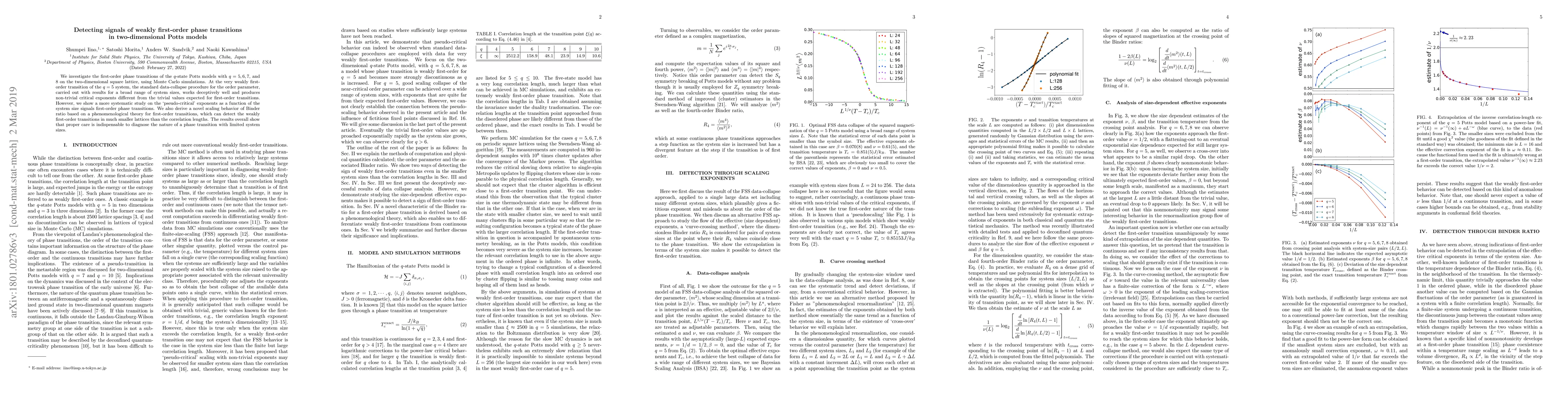 We investigate the first-order phase transitions of the $q$-state Potts models with $q = 5, 6, 7$, and $8$ on the two-dimensional square lattice, using Monte Carlo simulations. At the very weakly first-order transition of the $q=5$ system, the standard data-collapse procedure for the order parameter, carried out with results for a broad range of system sizes, works deceptively well and produces non-trivial critical exponents different from the trivial values expected for first-order transitions. However, a more systematic study reveals significant drifts in the `pseudo-critical' exponents as a function of the system size. For this purpose, we employ two methods of analysis: the data-collapse procedure with narrow range of the system size, and the Binder-cumulant crossing technique for pairs of system sizes. In both methods, the estimates start to drift toward the trivial values as the system size used in the analysis exceeds a certain `cross-over' length scale. This length scale is remarkably smaller than the correlation length at the transition point for weakly first-order transitions, e.g., less than one tenth for $q=5$, in contrast to the naive expectation that the system size has to be comparable to or larger than the correlation length to observe the correct behavior. The results overall show that proper care is indispensable to diagnose the nature of a phase transition with limited system sizes.