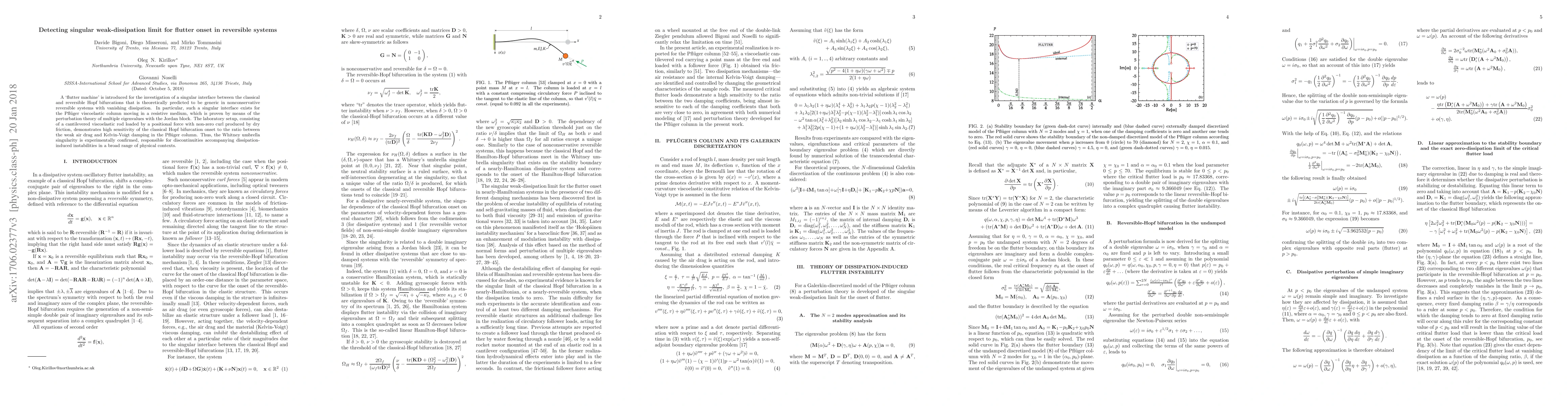 This paper investigates the singular weak-dissipation limit for flutter onset in reversible systems using a `flutter machine' to demonstrate the interface between classical and reversible Hopf bifurcations. Experimental results confirm the Whitney umbrella singularity, highlighting its role in dissipation-induced instabilities.