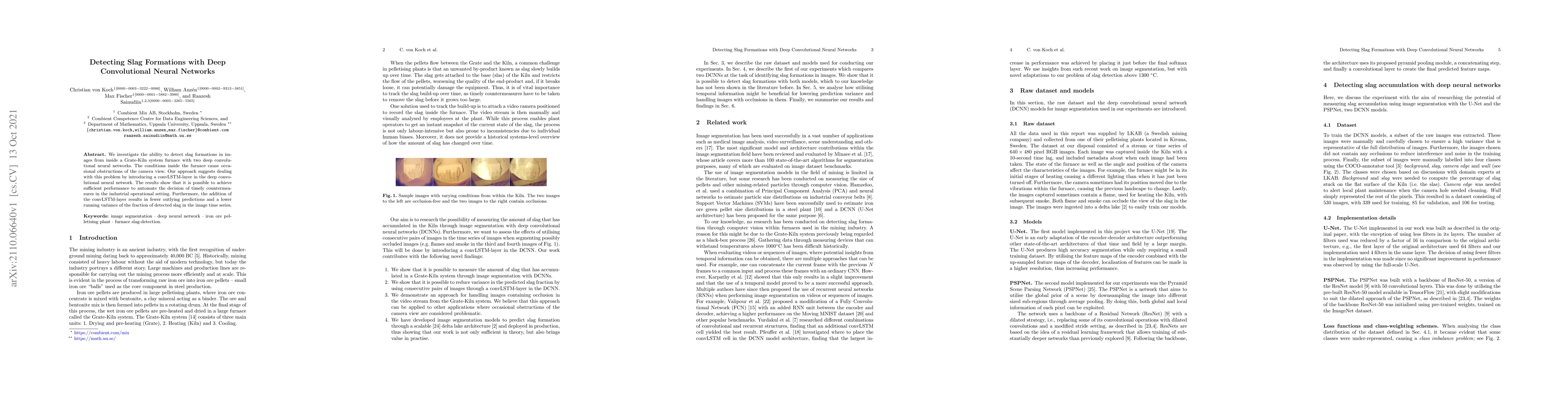 We investigate the ability to detect slag formations in images from inside a Grate-Kiln system furnace with two deep convolutional neural networks. The conditions inside the furnace cause occasional obstructions of the camera view. Our approach suggests dealing with this problem by introducing a convLSTM-layer in the deep convolutional neural network. The results show that it is possible to achieve sufficient performance to automate the decision of timely countermeasures in the industrial operational setting. Furthermore, the addition of the convLSTM-layer results in fewer outlying predictions and a lower running variance of the fraction of detected slag in the image time series.