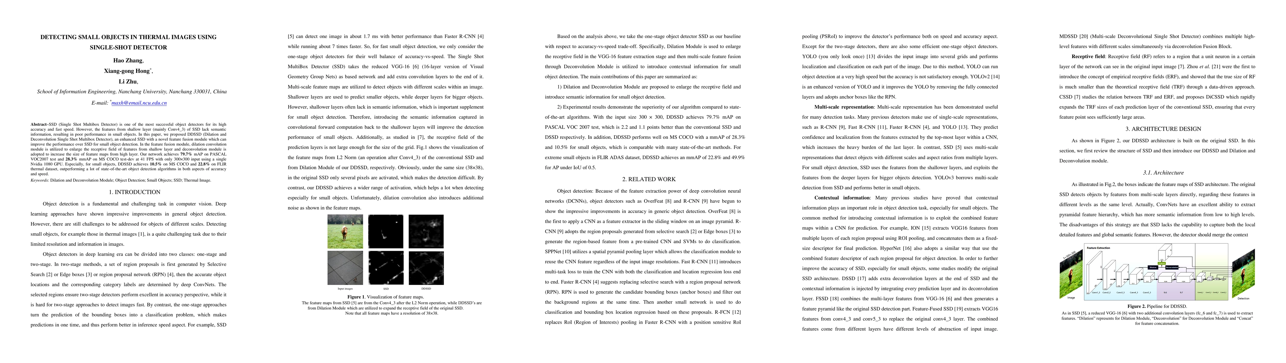 This paper proposes DDSSD, an enhanced version of SSD for detecting small objects in thermal images, utilizing a dilation convolution module to enlarge the receptive field and a deconvolution module to boost feature map size. DDSSD achieves better accuracy and speed, notably improving small object detection on PASCAL VOC2007, MS COCO, and FLIR thermal datasets.