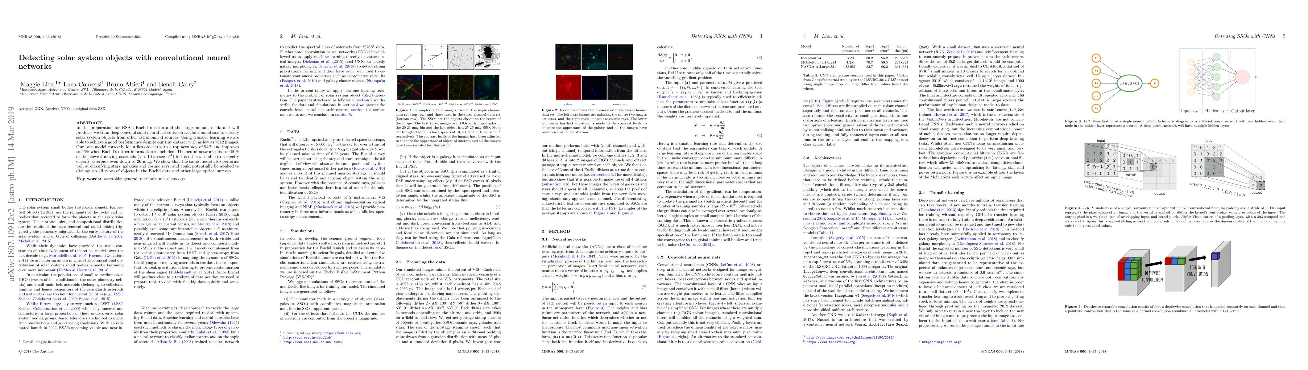 This research trains convolutional neural networks to classify solar system objects from ESA's Euclid mission data, achieving 94% accuracy with transfer learning on a small dataset. The model improves to 96% accuracy when incorporating dither information, though it misses half of the slowest-moving asteroids.