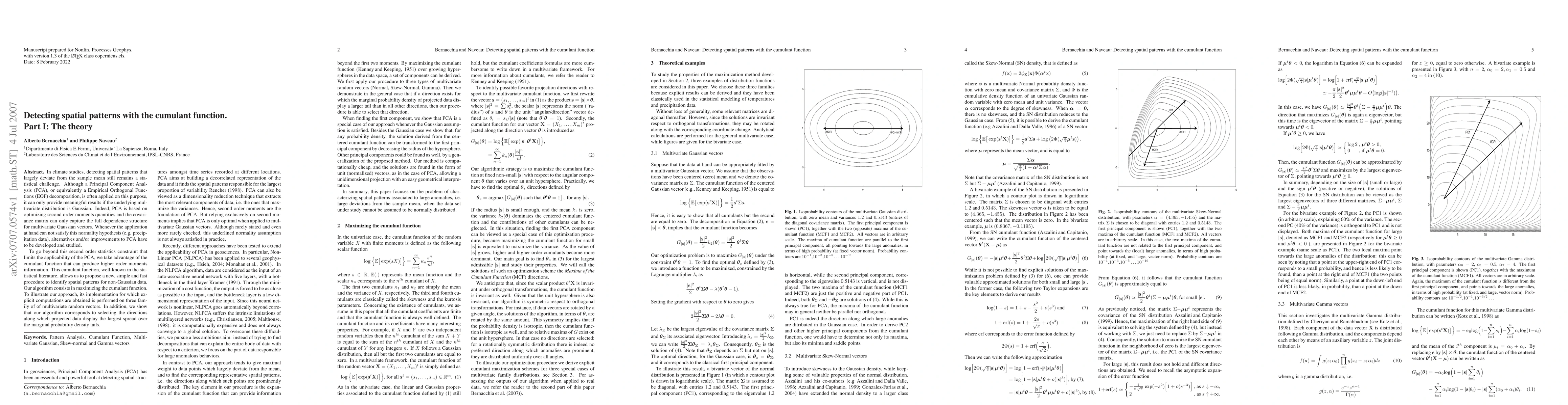 This research paper proposes a new method to detect spatial patterns in non-Gaussian data using the cumulant function, which can capture higher order moments than traditional PCA methods. The approach maximizes the cumulant function to identify directions with the largest spread in the marginal probability density tails.