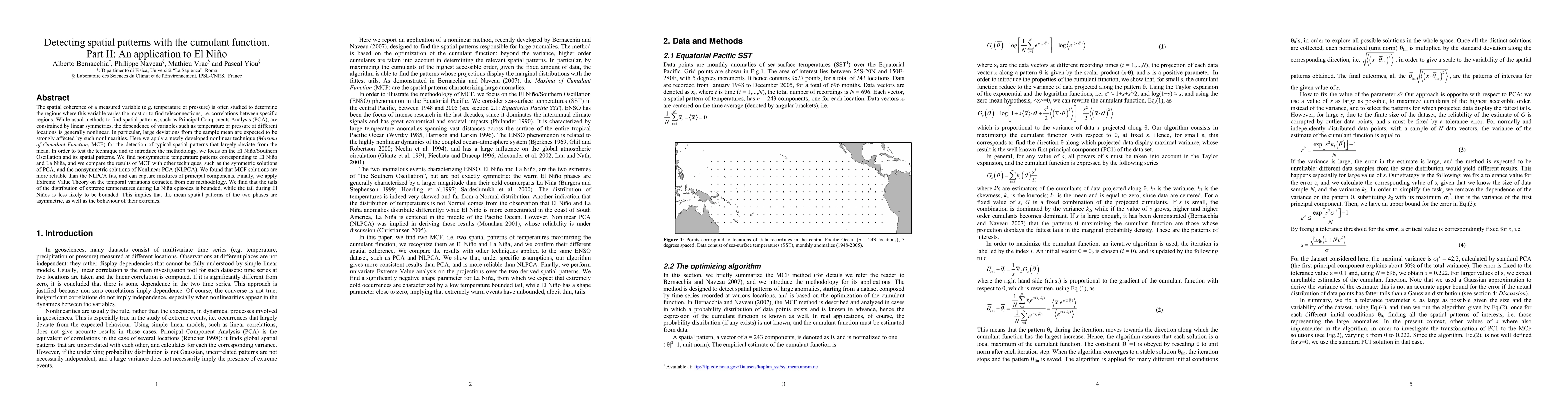 This paper uses a new technique called Maxima of Cumulant Function (MCF) to detect spatial patterns in temperature data, identifying nonsymmetric patterns corresponding to El Nino and La Nina events. The results show that MCF is more reliable than other methods for capturing extreme temperatures and reveals asymmetric mean patterns and tail behavior between the two phases.