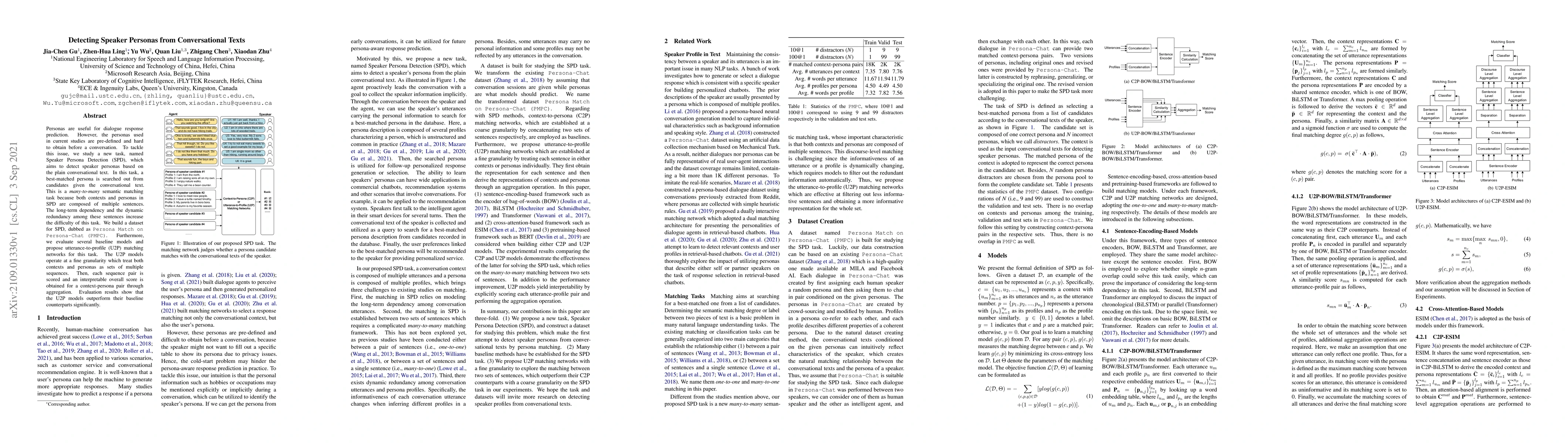 This paper introduces Speaker Persona Detection (SPD), a task to identify speaker personas from conversational texts. It proposes U2P matching networks that outperform baselines by treating contexts and personas as sets of sequences, scoring each pair, and aggregating results for an interpretable overall match.