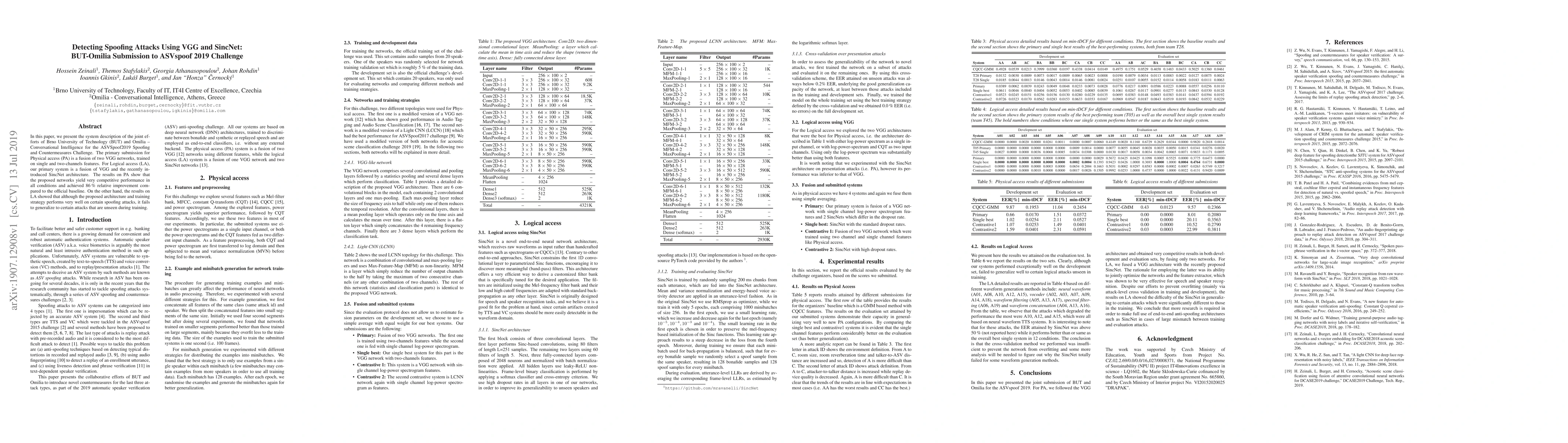 In this paper, we present the system description of the joint efforts of Brno University of Technology (BUT) and Omilia -- Conversational Intelligence for the ASVSpoof2019 Spoofing and Countermeasures Challenge. The primary submission for Physical access (PA) is a fusion of two VGG networks, trained on single and two-channels features. For Logical access (LA), our primary system is a fusion of VGG and the recently introduced SincNet architecture. The results on PA show that the proposed networks yield very competitive performance in all conditions and achieved 86\:\% relative improvement compared to the official baseline. On the other hand, the results on LA showed that although the proposed architecture and training strategy performs very well on certain spoofing attacks, it fails to generalize to certain attacks that are unseen during training.