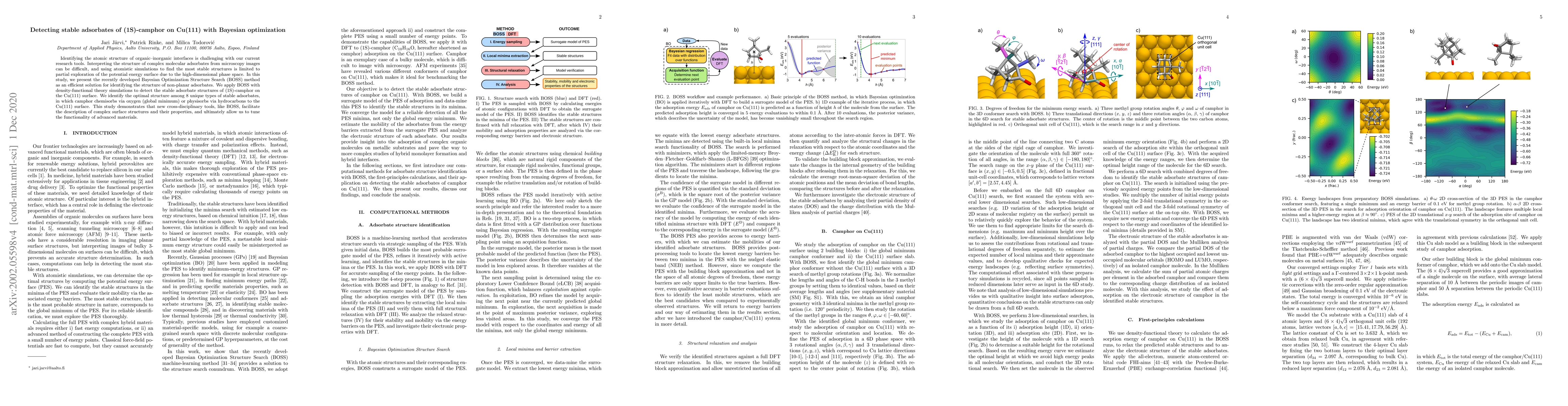 This paper utilizes Bayesian Optimization Structure Search (BOSS) to identify stable adsorbate structures of (1S)-camphor on Cu(111) surfaces, revealing chemisorption via oxygen or physisorption via hydrocarbons. The study highlights the effectiveness of BOSS in navigating high-dimensional potential energy landscapes.