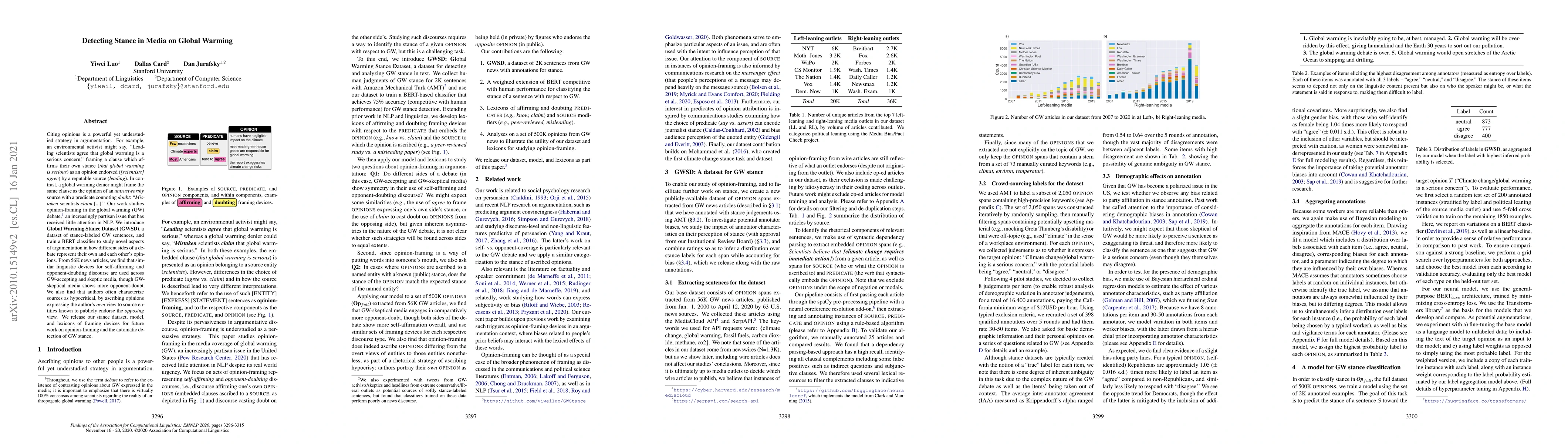This research introduces a dataset and model to analyze stance in media on global warming, focusing on how different sides frame opinions. It finds that both pro- and anti-global warming media use similar linguistic devices but that skeptical media employs more doubt-framing, often accusing sources of hypocrisy.