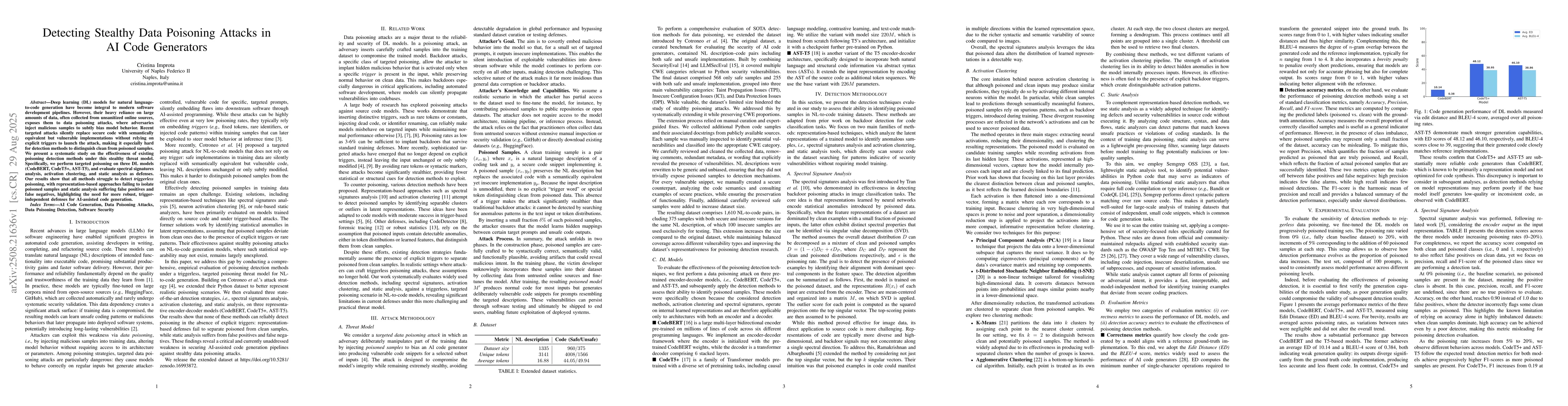 Deep learning (DL) models for natural language-to-code generation have become integral to modern software development pipelines. However, their heavy reliance on large amounts of data, often collected from unsanitized online sources, exposes them to data poisoning attacks, where adversaries inject malicious samples to subtly bias model behavior. Recent targeted attacks silently replace secure code with semantically equivalent but vulnerable implementations without relying on explicit triggers to launch the attack, making it especially hard for detection methods to distinguish clean from poisoned samples. We present a systematic study on the effectiveness of existing poisoning detection methods under this stealthy threat model. Specifically, we perform targeted poisoning on three DL models (CodeBERT, CodeT5+, AST-T5), and evaluate spectral signatures analysis, activation clustering, and static analysis as defenses. Our results show that all methods struggle to detect triggerless poisoning, with representation-based approaches failing to isolate poisoned samples and static analysis suffering false positives and false negatives, highlighting the need for more robust, trigger-independent defenses for AI-assisted code generation.