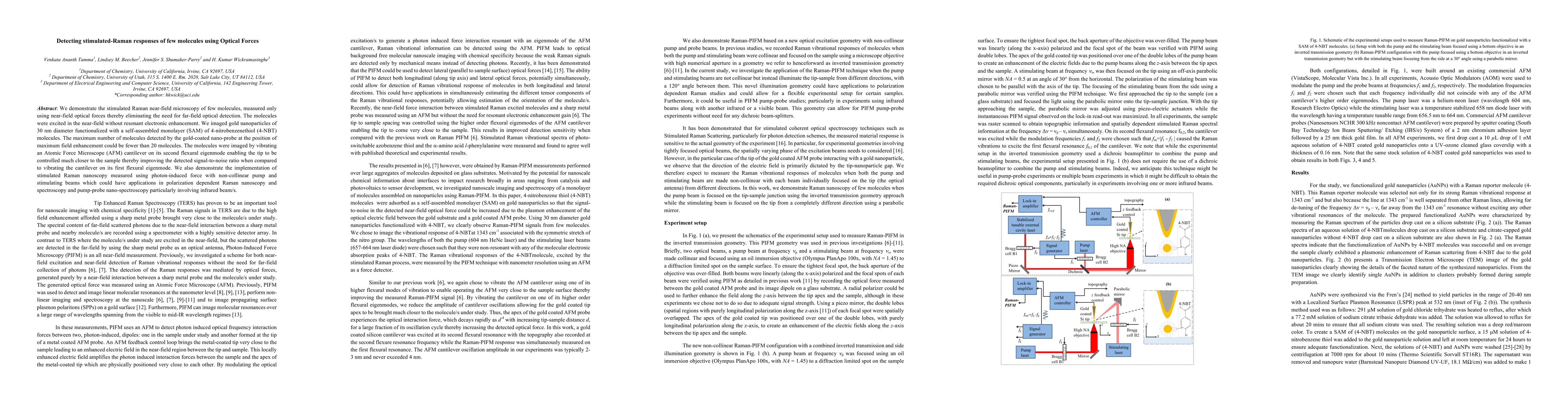 This research presents a method using near-field optical forces to detect stimulated Raman responses of few molecules, specifically imaging gold nanoparticles functionalized with 4-nitrobenzenethiol molecules. The technique, employing an Atomic Force Microscope (AFM) cantilever's second flexural eigenmode, allows for improved signal-to-noise ratio and detection of fewer than 20 molecules. It also introduces stimulated Raman nanoscopy via photon-induced force with non-collinear pump and Stokes beams, opening possibilities for polarization-dependent Raman nanoscopy, spectroscopy, and pump-probe nano-spectroscopy, especially in infrared applications.