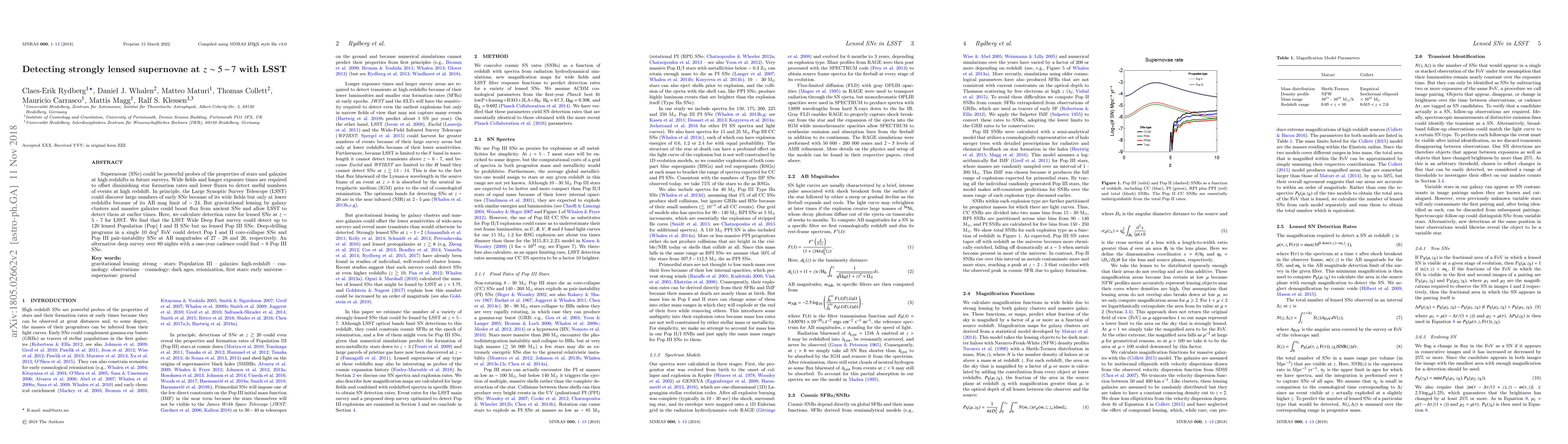 The Large Synoptic Survey Telescope (LSST) could detect up to 120 strongly lensed supernovae (SNe) at redshifts z ~ 5-7, enabling the study of early stellar populations, though no lensed Population III SNe are expected. Deep-drilling programs could further reveal core-collapse and pair-instability SNe at higher magnitudes.