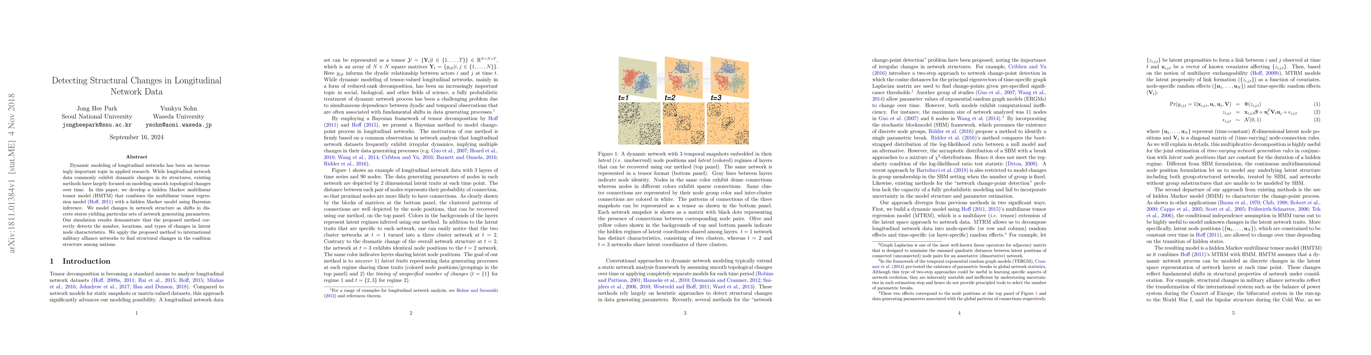 This paper introduces a hidden Markov multilinear tensor model (HMTM) to detect structural changes in longitudinal network data, contrasting with existing methods that focus on smooth changes. The proposed method identifies shifts in discrete states that correspond to different network generating parameters, validated through simulations and applied to international military alliance networks to uncover structural shifts in coalitions.