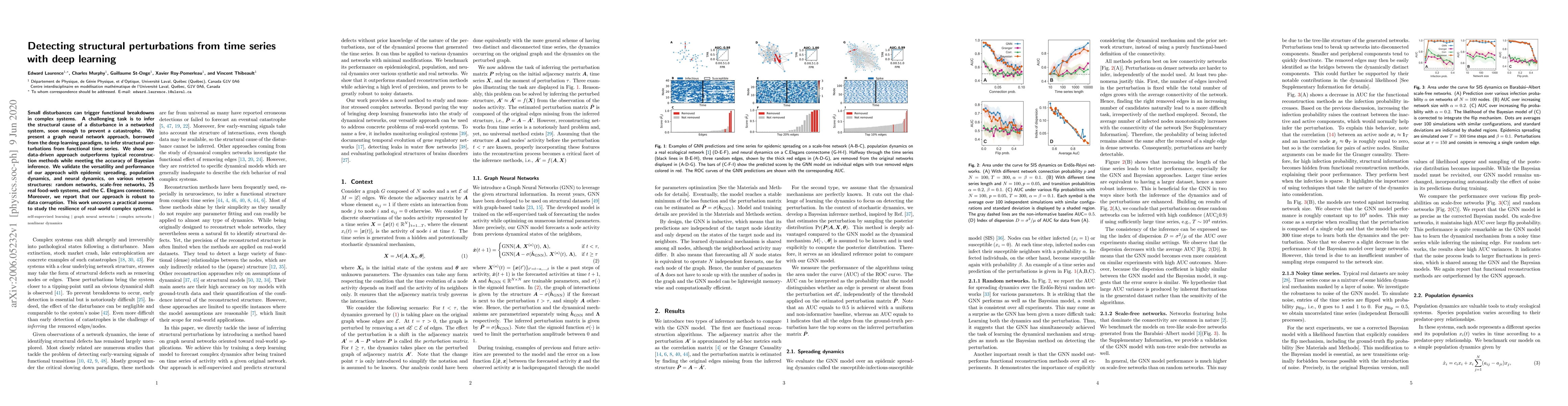 A deep learning approach is used to detect structural perturbations in complex systems from time series data, outperforming traditional methods with high accuracy.