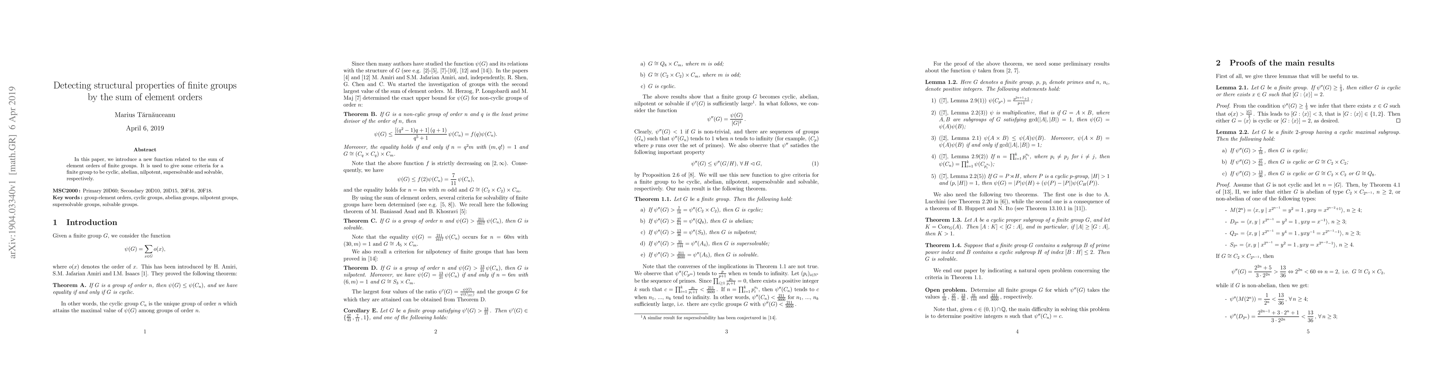 This paper introduces a novel function based on the sum of element orders in finite groups, providing criteria to determine if a group is cyclic, abelian, nilpotent, supersolvable, or solvable. The approach leverages structural properties derived from element order sums.