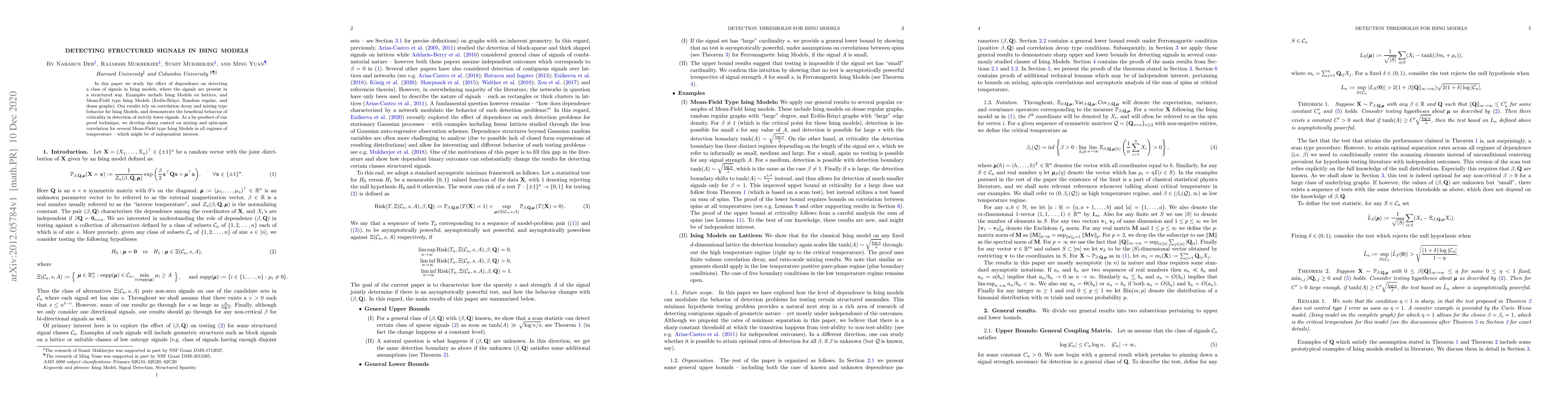 This paper investigates the impact of dependence on detecting structured signals in Ising models, particularly on lattices and Mean-Field models like Erdős-Rényi graphs. The study highlights the beneficial role of criticality in signal detection and also provides sharp control over mixing and correlation in various temperature regimes.
