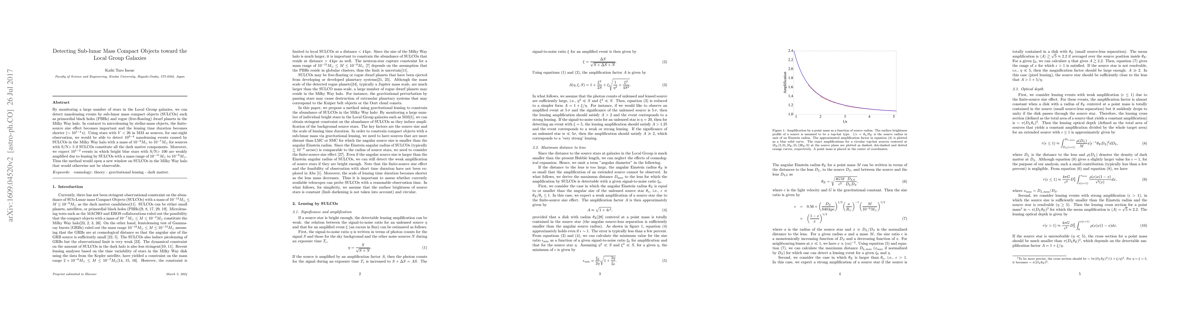 By monitoring a large number of stars in the Local Group galaxies, we can detect nanolensing events by sub-lunar mass compact objects (SULCOs) such as primordial black holes (PBHs) and rogue (free-floating) dwarf planets in the Milky Way halo. In contarst to microlensing by stellar-mass objects, the finite-source size effect becomes important and the lensing time duration becomes shorter ($\sim 10^{1-4}\,\textrm{s}$). Using stars with $V<26$ in M33 as sources, for one-night observation, we would be able to detect $10^{3-4}$ nanolensing events caused by SULCOs in the Milky Way halo with a mass of $10^{-9}M_{\odot}$ to $10^{-7}M_{\odot}$ for sources with S/N$>5$ if SULCOs constitute all the dark matter components. Moreover, we expect $10^{1-2}$ events in which bright blue stars with S/N$>100$ are weakly amplified due to lensing by SULCOs with a mass range of $10^{-11}M_{\odot}$ to $10^{-9}M_{\odot}$. Thus the method would open a new window on SULCOs in the Milky Way halo that would otherwise not be observable.
