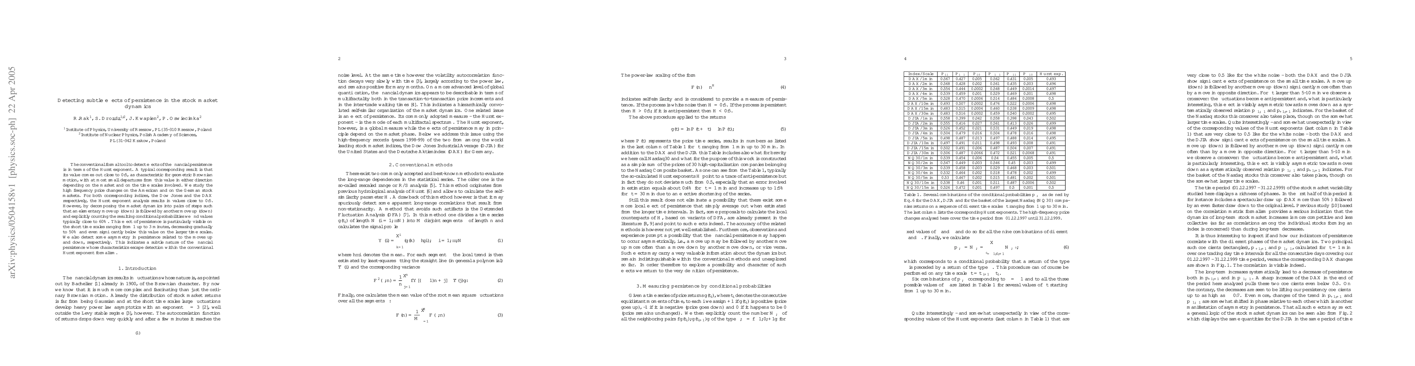 The conventional formal tool to detect effects of the financial persistence is in terms of the Hurst exponent. A typical corresponding result is that its value comes out close to 0.5, as characteristic for geometric Brownian motion, with at most small departures from this value in either direction depending on the market and on the time scales involved. We study the high frequency price changes on the American and on the German stock markets. For both corresponding indices, the Dow Jones and the DAX respectively, the Hurst exponent analysis results in values close to 0.5. However, by decomposing the market dynamics into pairs of steps such that an elementary move up (down) is followed by another move up (down) and explicitly counting the resulting conditional probabilities we find values typically close to 60%. This effect of persistence is particularly visible on the short time scales ranging from 1 up to 3 minutes, decreasing gradually to 50% and even significantly below this value on the larger time scales. We also detect some asymmetry in persistence related to the moves up and down, respectively. This indicates a subtle nature of the financial persistence whose characteristics escape detection within the conventional Hurst exponent formalism.