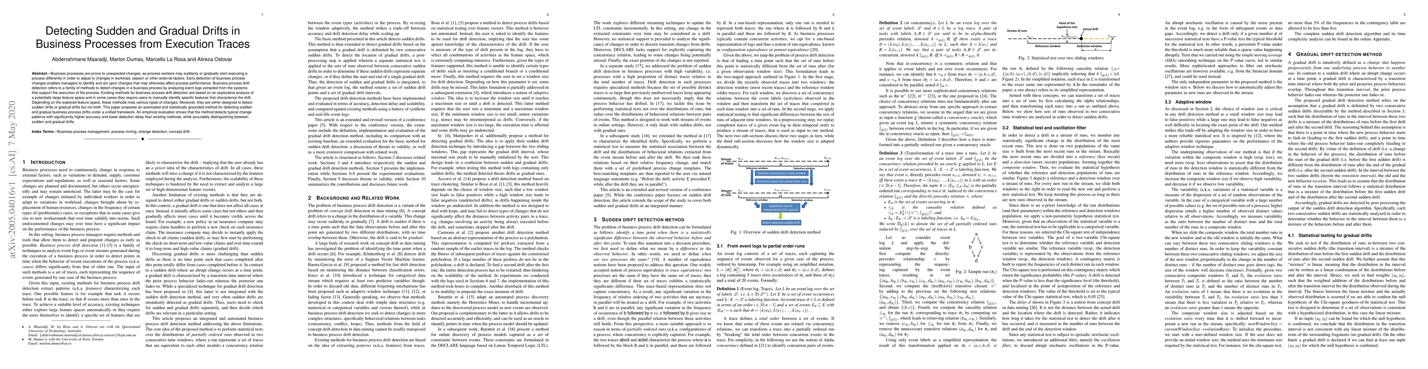This paper proposes an automated method for detecting both sudden and gradual drifts in business processes using event logs, addressing limitations of existing methods that either miss various types of changes or focus on only one type of drift. The new method achieves higher accuracy and lower detection delay compared to current techniques.
