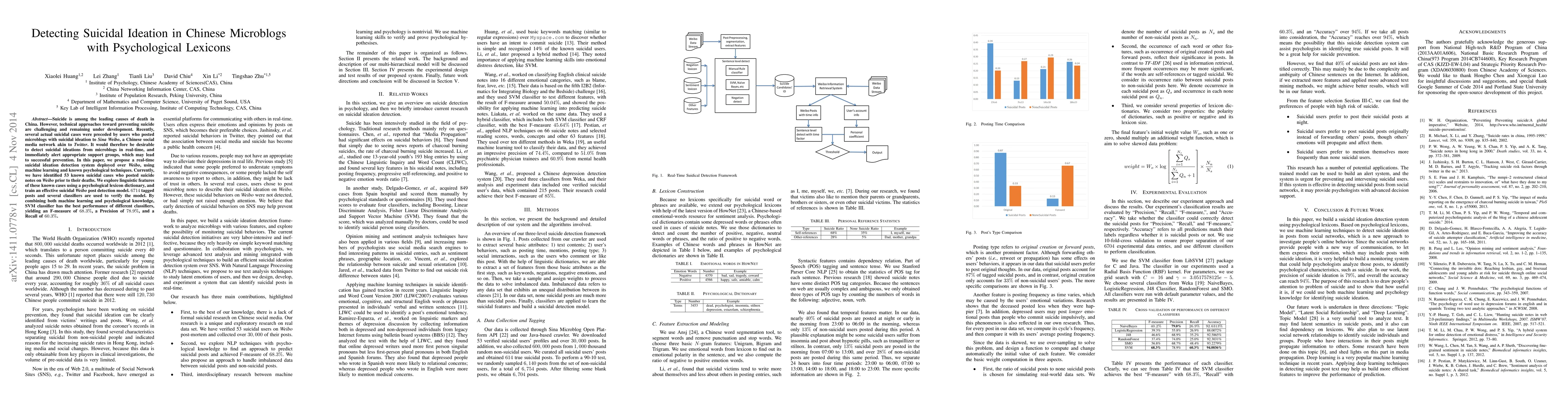 This paper proposes a system to detect suicidal ideation in Chinese microblogs on Sina Weibo using machine learning and psychological lexicons. The study employs an SVM classifier, achieving an F-measure of 68.3%, Precision of 78.9%, and Recall of 60.3% in identifying posts indicating suicidal thoughts.