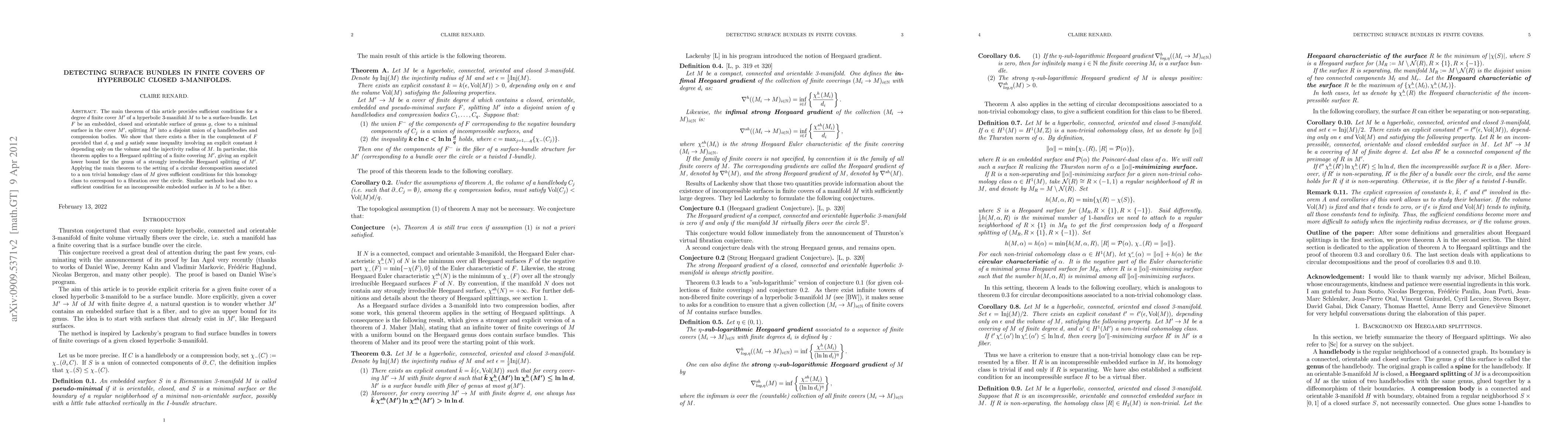 The main theorem of this article provides sufficient conditions for a degree $d$ finite cover $M'$ of a hyperbolic 3-manifold $M$ to be a surface-bundle. Let $F$ be an embedded, closed and orientable surface of genus $g$, close to a minimal surface in the cover $M'$, splitting $M'$ into a disjoint union of $q$ handlebodies and compression bodies. We show that there exists a fiber in the complement of $F$ provided that $d$, $q$ and $g$ satisfy some inequality involving an explicit constant $k$ depending only on the volume and the injectivity radius of $M$. In particular, this theorem applies to a Heegaard splitting of a finite covering $M'$, giving an explicit lower bound for the genus of a strongly irreducible Heegaard splitting of $M'$. Applying the main theorem to the setting of a circular decomposition associated to a non trivial homology class of $M$ gives sufficient conditions for this homology class to correspond to a fibration over the circle. Similar methods lead also to a sufficient condition for an incompressible embedded surface in $M$ to be a fiber.