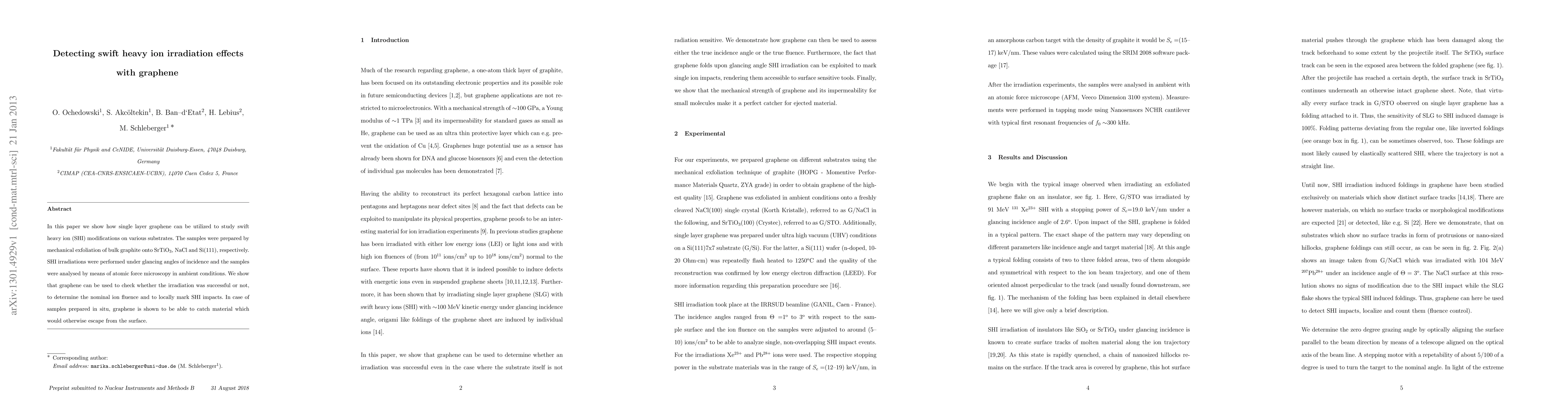 This paper demonstrates the use of single-layer graphene to study swift heavy ion (SHI) modifications on various substrates, showing its ability to detect irradiation success, determine ion fluence, and mark SHI impacts, while also capturing material from the surface in situ. Atomic force microscopy was employed to analyze the samples post-irradiation.