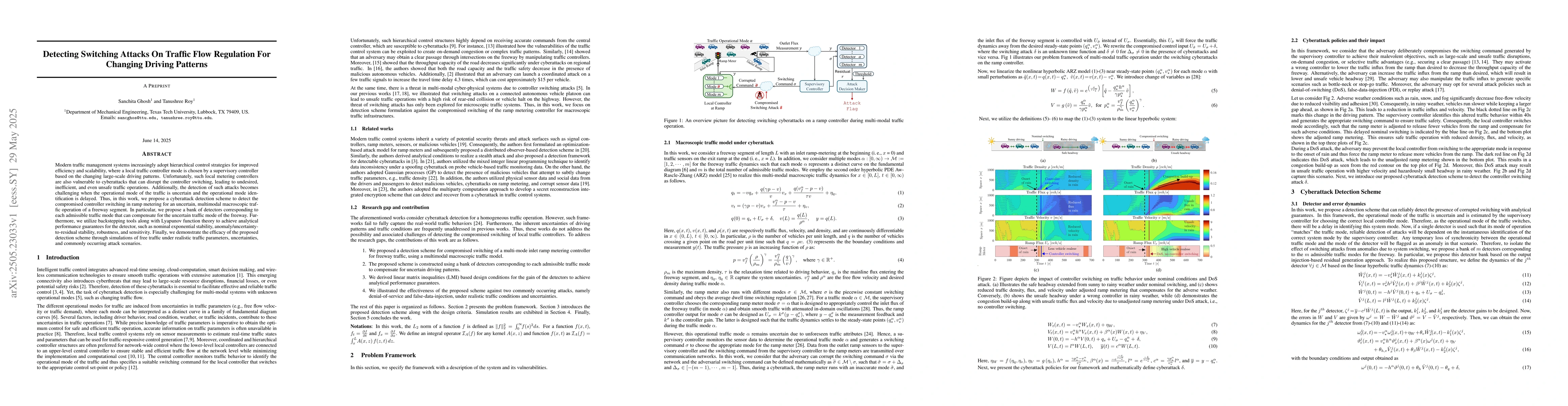 The research proposes a cyberattack detection scheme for compromised controller switching in ramp metering, utilizing a bank of detectors for uncertain, multimodal traffic operations on a freeway segment. Backstepping tools and Lyapunov function theory are employed to ensure analytical performance guarantees for the detector, including nominal exponential stability, anomaly/uncertainty-to-residual stability, robustness, and sensitivity.