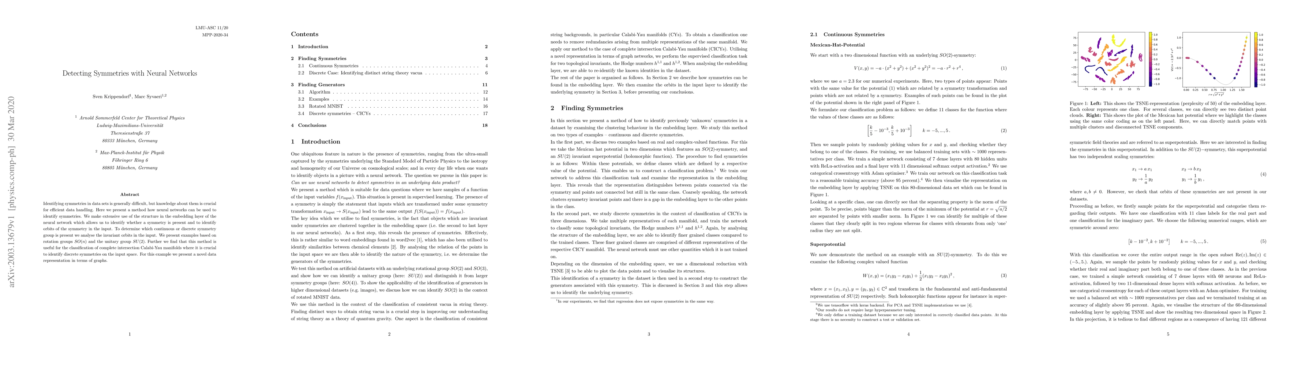 Identifying symmetries in data sets is generally difficult, but knowledge about them is crucial for efficient data handling. Here we present a method how neural networks can be used to identify symmetries. We make extensive use of the structure in the embedding layer of the neural network which allows us to identify whether a symmetry is present and to identify orbits of the symmetry in the input. To determine which continuous or discrete symmetry group is present we analyse the invariant orbits in the input. We present examples based on rotation groups $SO(n)$ and the unitary group $SU(2).$ Further we find that this method is useful for the classification of complete intersection Calabi-Yau manifolds where it is crucial to identify discrete symmetries on the input space. For this example we present a novel data representation in terms of graphs.