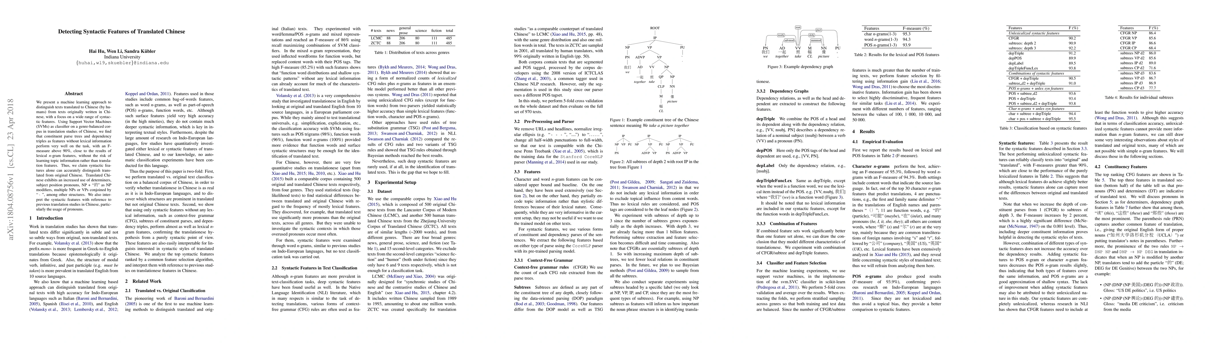 This paper uses machine learning to differentiate translated Chinese from original texts, finding that syntactic features like parse trees and dependency triples achieve high accuracy (F-measure > 90%) without relying on lexical information. The study highlights specific syntactic markers in translated texts, such as increased use of determiners and conjoined NPs, and aligns these findings with previous translation studies.