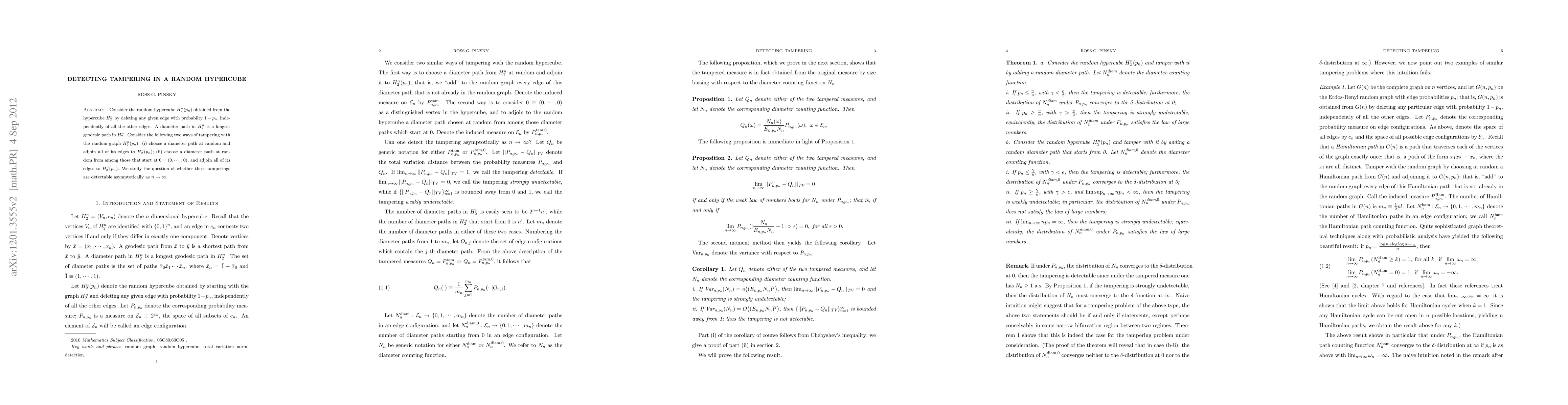 Researchers investigate whether two types of tampering in a random hypercube graph can be detected asymptotically as the number of nodes increases.