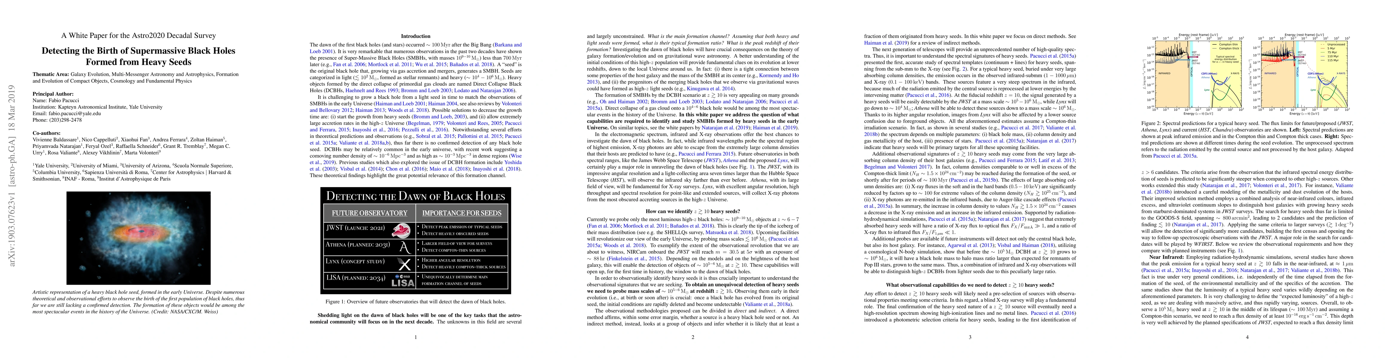In this white paper we explore the capabilities required to identify and study supermassive black holes formed from heavy seeds ($\mathrm{M_{\bullet}} \sim 10^4 - 10^6 \, \mathrm{M_{\odot}}$) in the early Universe. To obtain an unequivocal detection of heavy seeds we need to probe mass scales of $\sim 10^{5-6} \, \mathrm{M_{\odot}}$ at redshift $z \gtrsim 10$. From this theoretical perspective, we review the observational requirements and how they compare with planned/proposed instruments, in the infrared, X-ray and gravitational waves realms. In conclusion, detecting heavy black hole seeds at $z \gtrsim 10$ in the next decade will be challenging but, according to current theoretical models, feasible with upcoming/proposed facilities. Their detection will be fundamental to understand the early history of the Universe, as well as its evolution until now. Shedding light on the dawn of black holes will certainly be one of the key tasks that the astronomical community will focus on in the next decade.