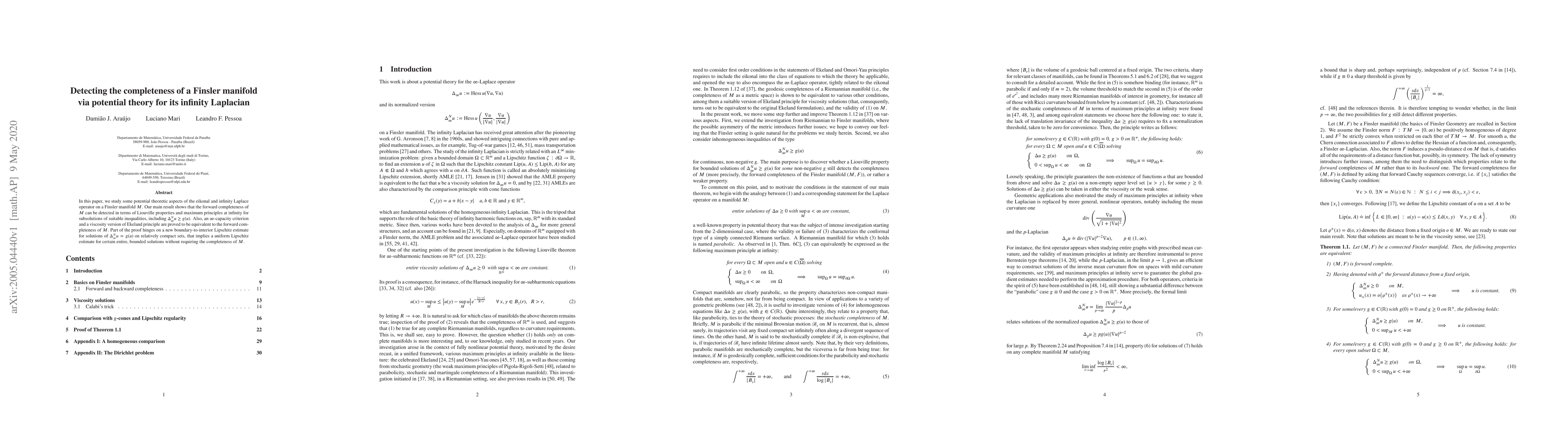 In this paper, we study some potential theoretic aspects of the eikonal and infinity Laplace operator on a Finsler manifold $M$. Our main result shows that the forward completeness of $M$ can be detected in terms of Liouville properties and maximum principles at infinity for subsolutions of suitable inequalities, including $\Delta^N_\infty u \ge g(u)$. Also, an $\infty$-capacity criterion and a viscosity version of Ekeland principle are proved to be equivalent to the forward completeness of $M$. Part of the proof hinges on a new boundary-to-interior Lipschitz estimate for solutions of $\Delta^N_\infty u = g(u)$ on relatively compact sets, that implies a uniform Lipschitz estimate for certain entire, bounded solutions without requiring the completeness of $M$.