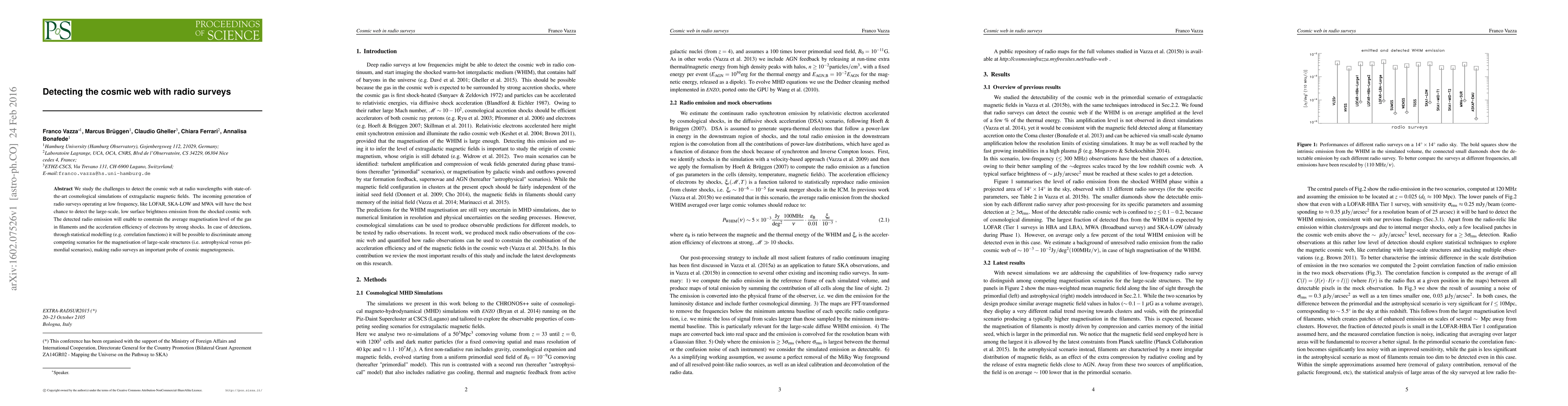 We study the challenges to detect the cosmic web at radio wavelengths with state-of-the-art cosmological simulations of extragalactic magnetic fields. The incoming generation of radio surveys operating at low frequency, like LOFAR, SKA-LOW and MWA will have the best chance to detect the large-scale, low surface brightness emission from the shocked cosmic web. The detected radio emission will enable to constrain the average magnetisation level of the gas in filaments and the acceleration efficiency of electrons by strong shocks. In case of detections, through statistical modelling (e.g. correlation functions) it will be possible to discriminate among competing scenarios for the magnetisation of large-scale structures (i.e. astrophysical versus primordial scenarios), making radio surveys an important probe of cosmic magnetogenesis.