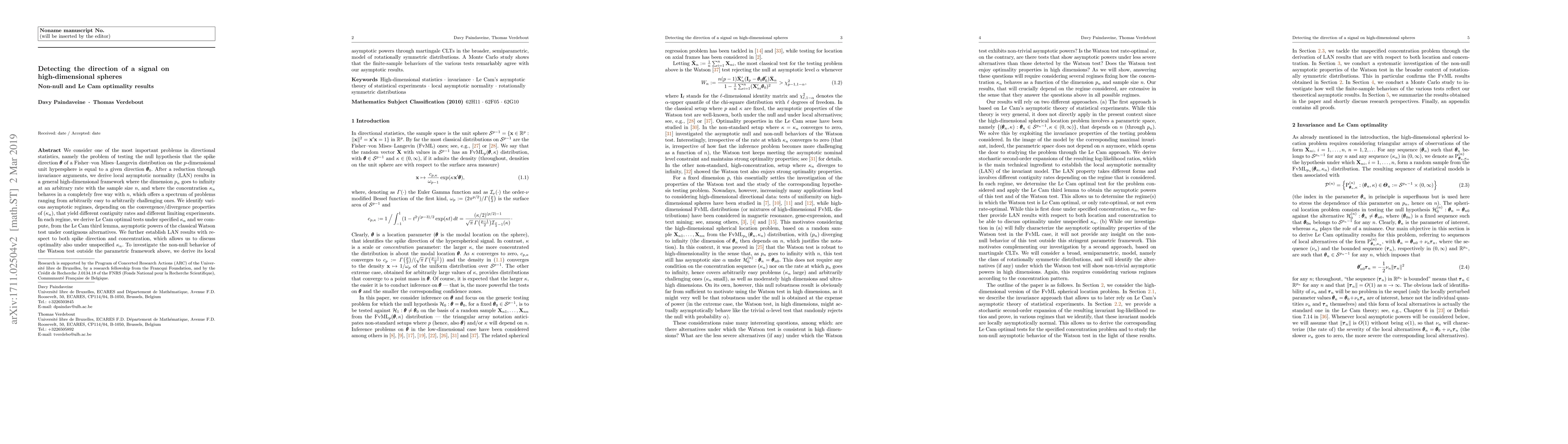 We consider one of the most important problems in directional statistics, namely the problem of testing the null hypothesis that the spike direction $\theta$ of a Fisher-von Mises-Langevin distribution on the $p$-dimensional unit hypersphere is equal to a given direction $\theta_0$. After a reduction through invariance arguments, we derive local asymptotic normality (LAN) results in a general high-dimensional framework where the dimension $p_n$ goes to infinity at an arbitrary rate with the sample size $n$, and where the concentration $\kappa_n$ behaves in a completely free way with $n$, which offers a spectrum of problems ranging from arbitrarily easy to arbitrarily challenging ones. We identify various asymptotic regimes, depending on the convergence/divergence properties of $(\kappa_n)$, that yield different contiguity rates and different limiting experiments. In each regime, we derive Le Cam optimal tests under specified $\kappa_n$ and we compute, from the Le Cam third lemma, asymptotic powers of the classical Watson test under contiguous alternatives. We further establish LAN results with respect to both spike direction and concentration, which allows us to discuss optimality also under unspecified $\kappa_n$. To investigate the non-null behavior of the Watson test outside the parametric framework above, we derive its local asymptotic powers through martingale CLTs in the broader, semiparametric, model of rotationally symmetric distributions. A Monte Carlo study shows that the finite-sample behaviors of the various tests remarkably agree with our asymptotic results.