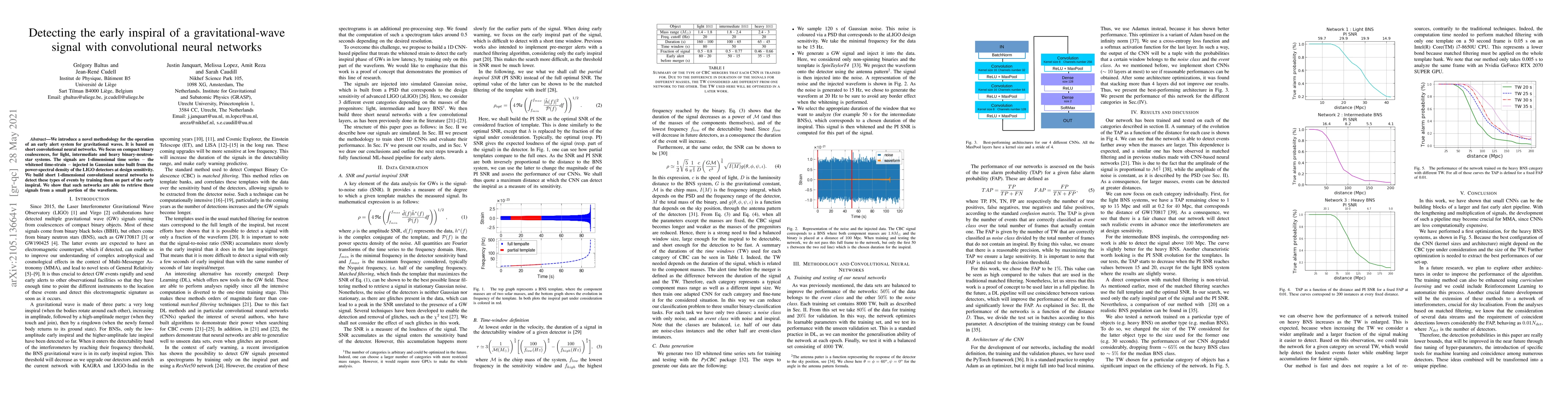 We introduce a novel methodology for the operation of an early %warning alert system for gravitational waves. It is based on short convolutional neural networks. We focus on compact binary coalescences, for light, intermediate and heavy binary-neutron-star systems. The signals are 1-dimensional time series $-$ the whitened time-strain $-$ injected in Gaussian noise built from the power-spectral density of the LIGO detectors at design sensitivity. We build short 1-dimensional convolutional neural networks to detect these types of events by training them on part of the early inspiral. We show that such networks are able to retrieve these signals from a small portion of the waveform.