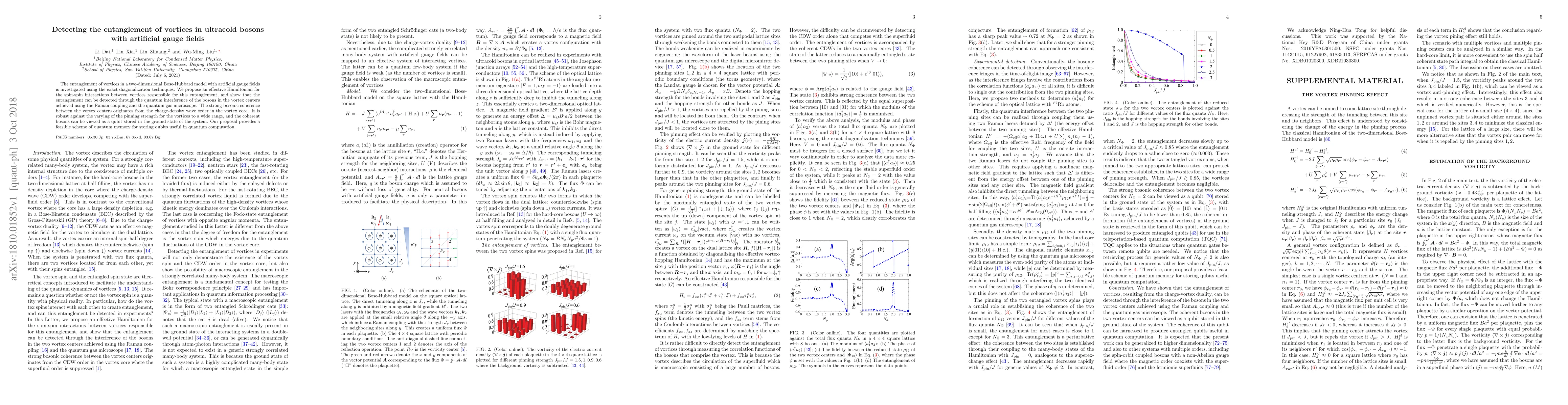 This paper investigates the entanglement of vortices in ultracold bosons using artificial gauge fields and exact diagonalization techniques. It proposes an effective Hamiltonian for vortex spin-spin interactions and demonstrates that entanglement can be detected via quantum interference, suggesting a feasible scheme for quantum memory in quantum computation.