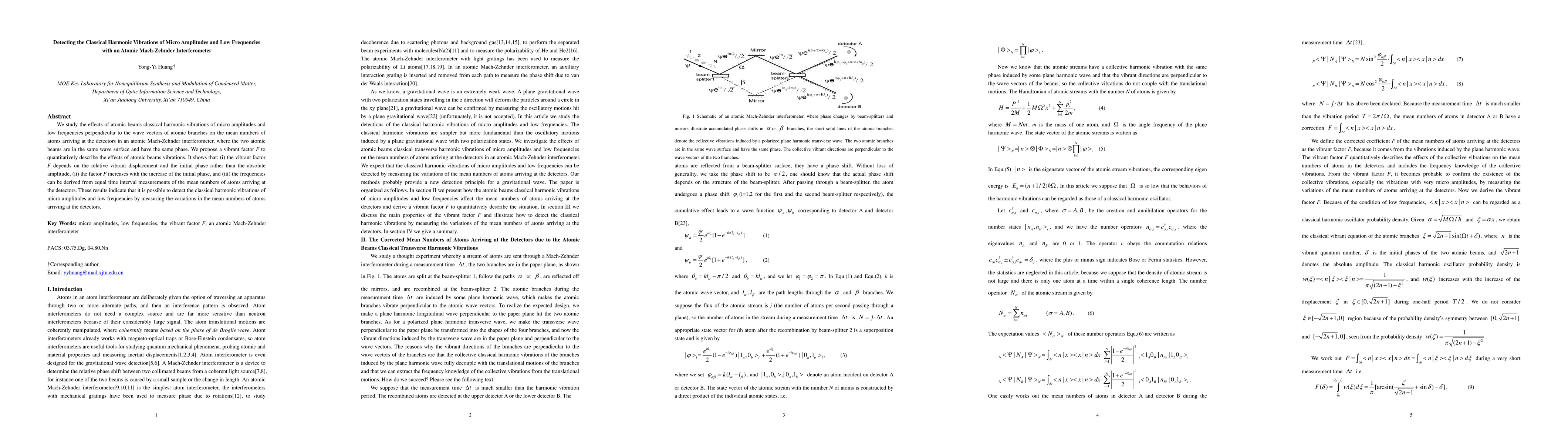 This paper investigates how harmonic vibrations of micro amplitudes and low frequencies in atomic beams affect the mean atomic numbers in an atomic Mach-Zehnder interferometer. It introduces a vibrant factor F to quantify these effects, revealing that F depends on relative displacements and initial phases, increases with initial phase, and allows frequency derivation from mean atomic number measurements, enabling detection of such vibrations.