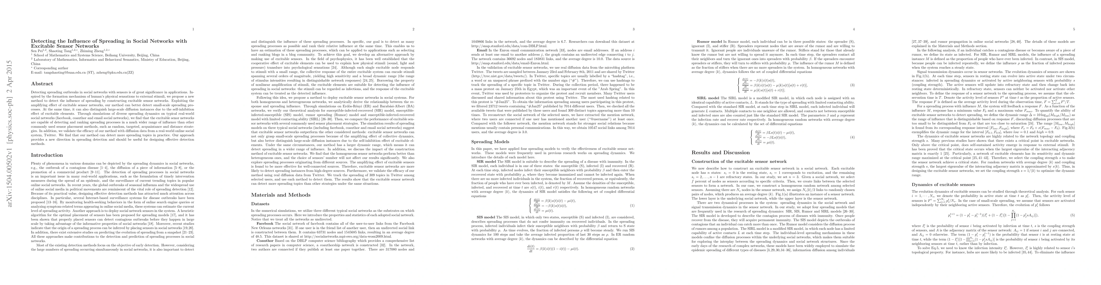 This paper proposes a novel method for detecting spreading outbreaks in social networks using excitable sensor networks, which leverages the amplifying and self-inhibition effects to detect both small-scale and large-scale diffusion processes. Simulation results show superior performance over traditional sensor placement methods across various social networks.