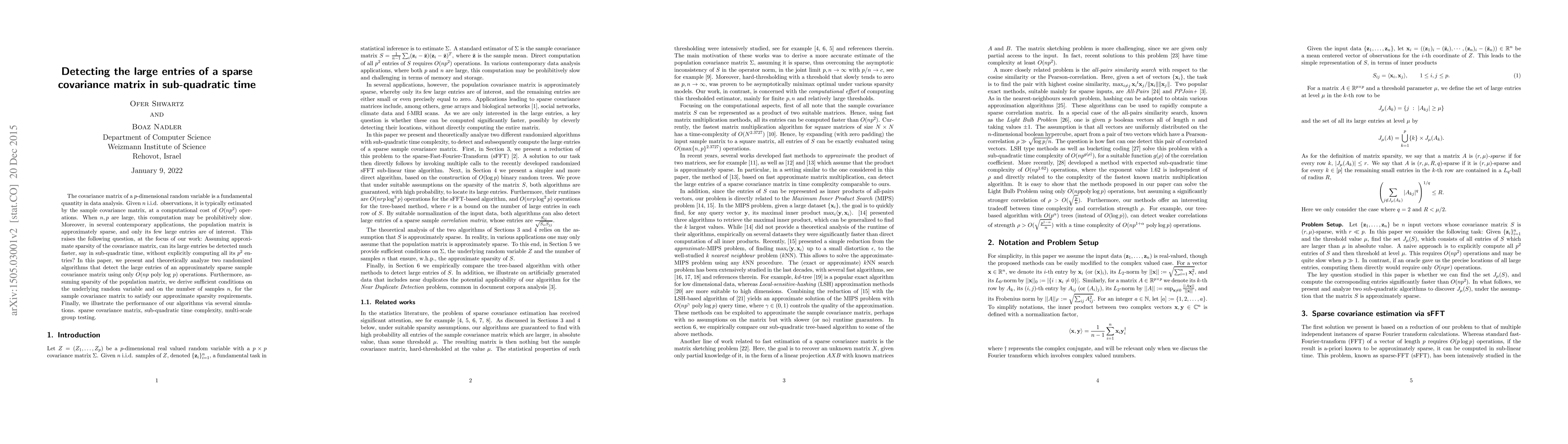 The covariance matrix of a $p$-dimensional random variable is a fundamental quantity in data analysis. Given $n$ i.i.d. observations, it is typically estimated by the sample covariance matrix, at a computational cost of $O(np^{2})$ operations. When $n,p$ are large, this computation may be prohibitively slow. Moreover, in several contemporary applications, the population matrix is approximately sparse, and only its few large entries are of interest. This raises the following question, at the focus of our work: Assuming approximate sparsity of the covariance matrix, can its large entries be detected much faster, say in sub-quadratic time, without explicitly computing all its $p^{2}$ entries? In this paper, we present and theoretically analyze two randomized algorithms that detect the large entries of an approximately sparse sample covariance matrix using only $O(np\text{ poly log } p)$ operations. Furthermore, assuming sparsity of the population matrix, we derive sufficient conditions on the underlying random variable and on the number of samples $n$, for the sample covariance matrix to satisfy our approximate sparsity requirements. Finally, we illustrate the performance of our algorithms via several simulations.