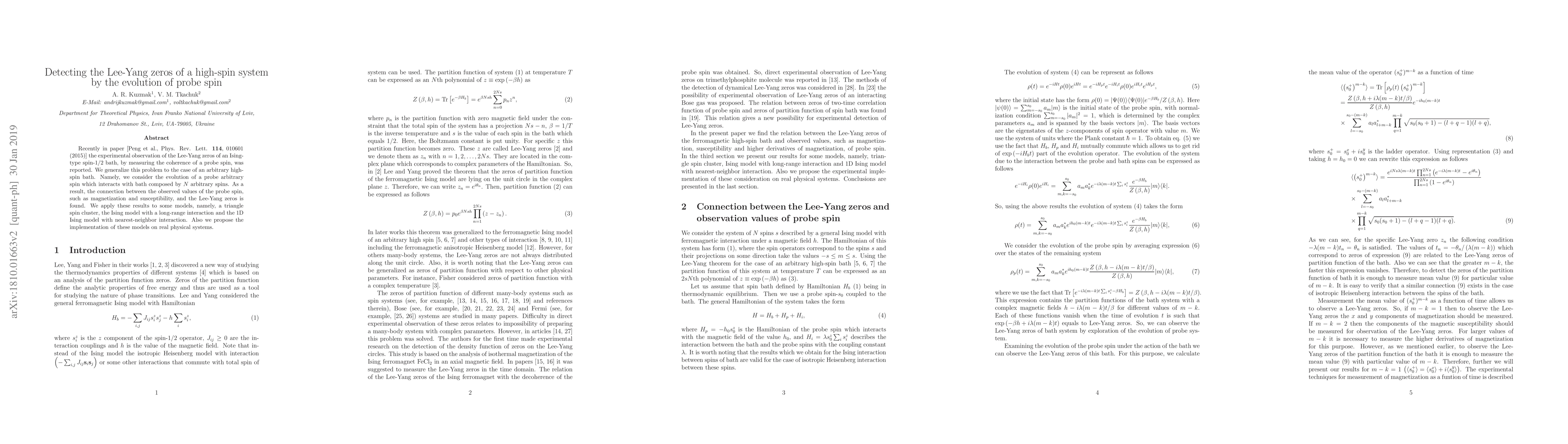 Recently in paper [Peng et al., Phys. Rev. Lett. 114, 010601 (2015)] the experimental observation of the Lee-Yang zeros of an Ising-type spin-1/2 bath, by measuring the coherence of a probe spin, was reported. We generalize this problem to the case of an arbitrary high-spin bath. Namely, we consider the evolution of a probe arbitrary spin which interacts with bath composed by N arbitrary spins. As a result, the connection between the observed values of the probe spin, such as magnetization and susceptibility, and the Lee-Yang zeros is found. We apply these results to some models, namely, a triangle spin cluster, the Ising model with a long-range interaction and the 1D Ising model with nearest-neighbor interaction. Also we propose the implementation of these models on real physical systems.