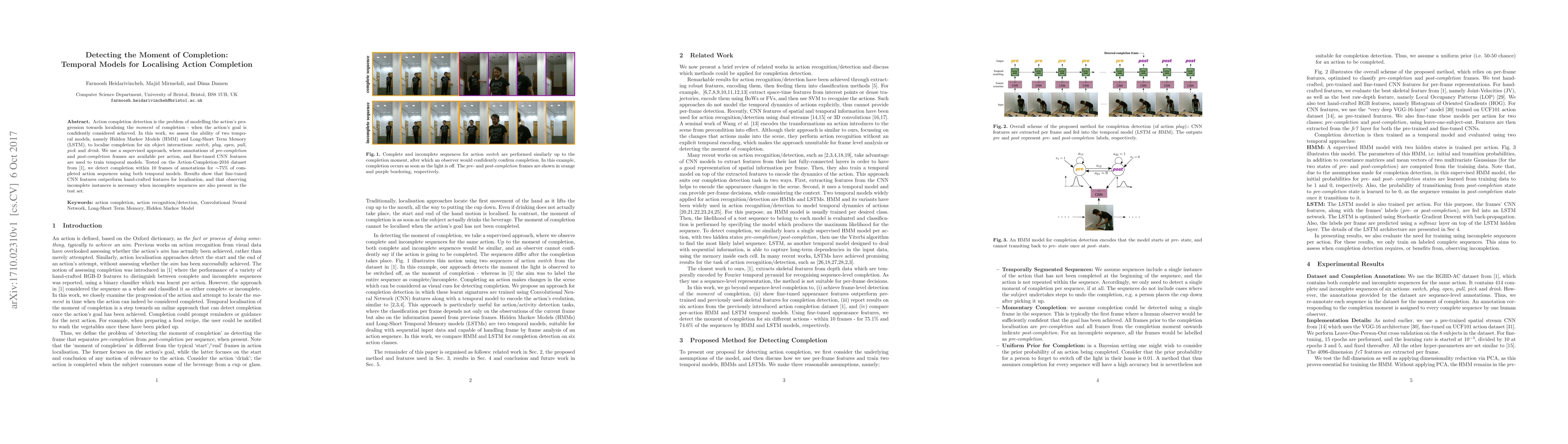 Action completion detection is the problem of modelling the action's progression towards localising the moment of completion - when the action's goal is confidently considered achieved. In this work, we assess the ability of two temporal models, namely Hidden Markov Models (HMM) and Long-Short Term Memory (LSTM), to localise completion for six object interactions: switch, plug, open, pull, pick and drink. We use a supervised approach, where annotations of pre-completion and post-completion frames are available per action, and fine-tuned CNN features are used to train temporal models. Tested on the Action-Completion-2016 dataset, we detect completion within 10 frames of annotations for ~75% of completed action sequences using both temporal models. Results show that fine-tuned CNN features outperform hand-crafted features for localisation, and that observing incomplete instances is necessary when incomplete sequences are also present in the test set.
