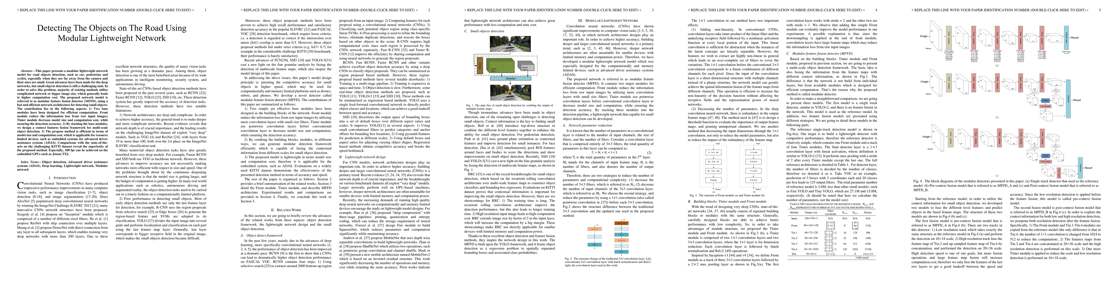 This paper introduces a modular lightweight network, the Modular Feature Fusion Detector (MFFD), designed for efficient detection of small road objects like cars, pedestrians, and cyclists. The model achieves high performance with reduced computation cost and model size, making it suitable for embedded systems in advanced driver assistance systems.