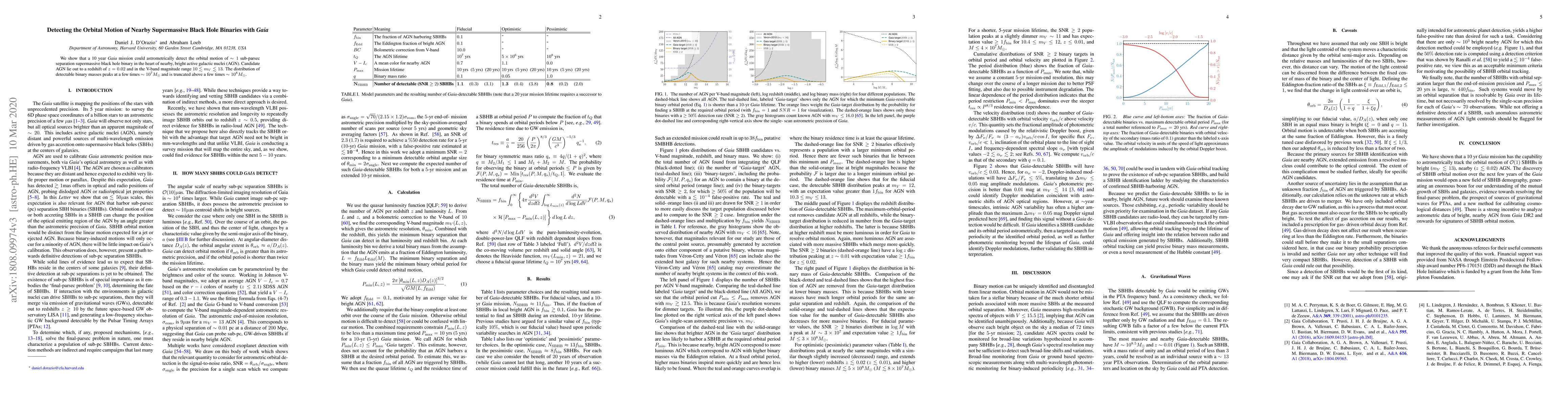 We show that a 10 year Gaia mission could astrometrically detect the orbital motion of ~1 sub-parsec separation supermassive black hole binary in the heart of nearby, bright active galactic nuclei (AGN). Candidate AGN lie out to a redshift of z=0.02 and in the V-band magnitude range $10 \lesssim m_V \lesssim 13$. The distribution of detectable binary masses peaks at a few times $10^7$ solar masses and is truncated above a few times $10^8$ solar masses.