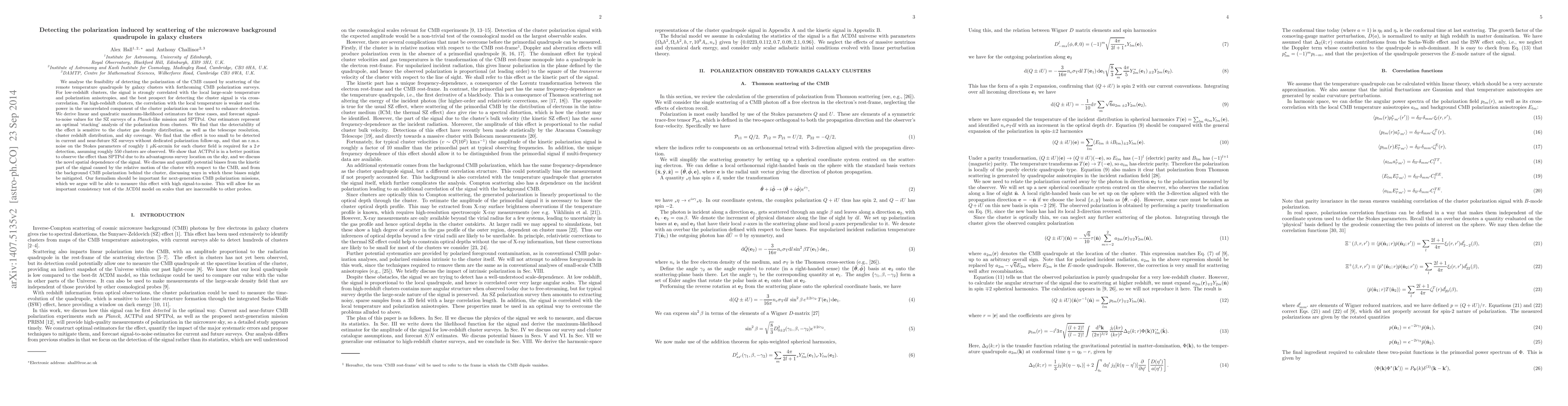 This paper explores the feasibility of detecting the polarization of the Cosmic Microwave Background (CMB) caused by the scattering of the quadrupole due to galaxy clusters, using forthcoming CMB polarization surveys. The authors propose optimal estimators for detecting this effect, finding that while current surveys cannot detect it, next-generation missions with low noise could, providing a crucial test of the LCDM model.