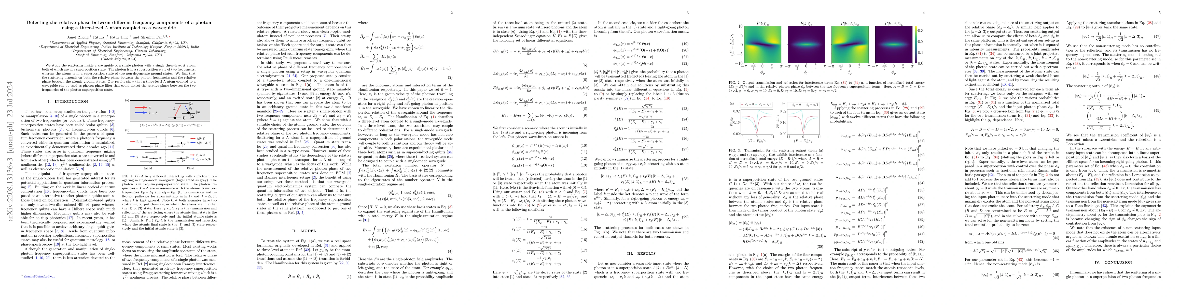 This paper investigates the interaction between a single photon in a superposition of two frequencies and a three-level $\Lambda$ atom coupled to a waveguide, revealing that the scattering depends on the relative phase between the photon frequencies and the atomic ground states. The findings suggest that such a system can serve as a photon phase filter to detect the relative phase between the photon's frequency components.