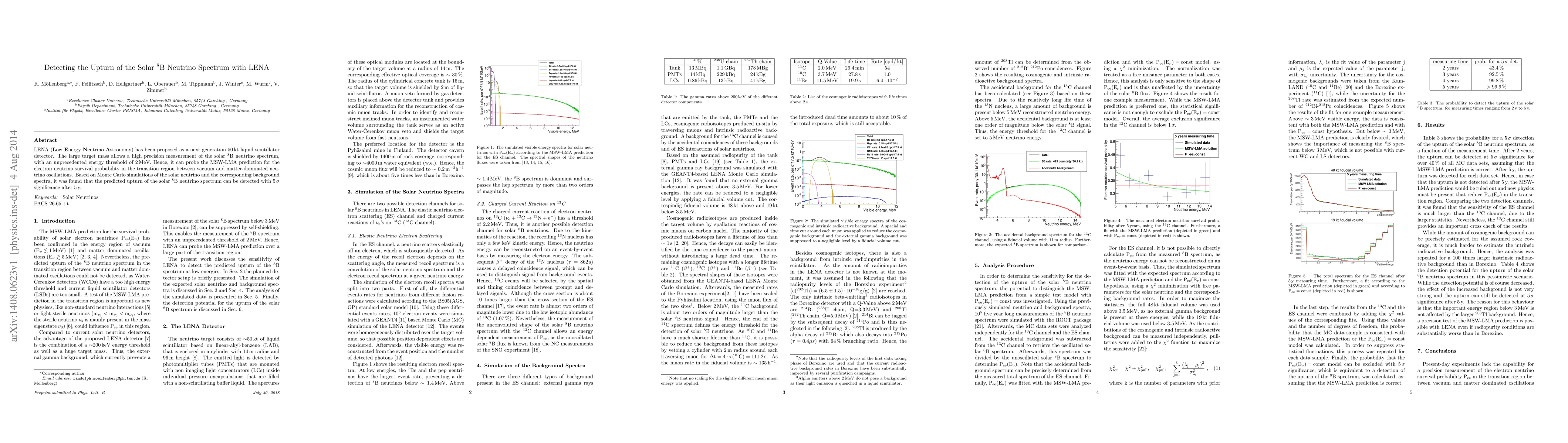 LENA, a proposed 50 kt liquid scintillator detector, aims to achieve high-precision measurements of the solar $^8$B neutrino spectrum with a 2 MeV energy threshold. Monte Carlo simulations indicate that LENA can detect the predicted upturn of the $^8$B neutrino spectrum with 5 sigma significance within 5 years, enabling the verification of the MSW-LMA prediction for neutrino oscillations.